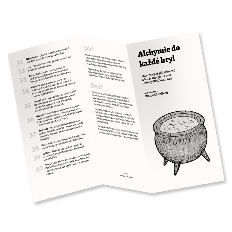 2k20 magických lektvarů, a jak je zapojit do vaší fantasy RPG kampaně. Brožura s lektvary slouží jako jednouchá pomůcka pro vypravěče. Brožura je universální a není závislá na žádném systému. 50% z prodejní ceny putuje autorovi na další tvorbu a provoz webových stránek 2k6goblinu.blogspot.com.