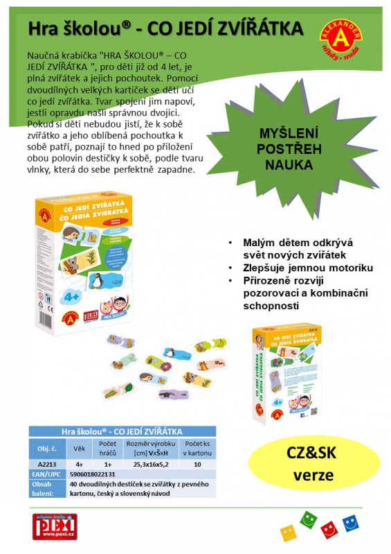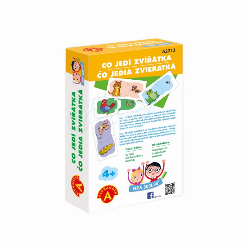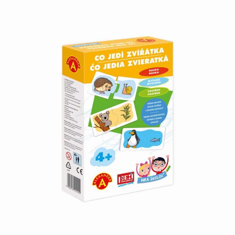 Naučné hraní pro malé zvědavce. Krabička "HRA ŠKOLOU® – CO JEDÍ ZVÍŘÁTKA ", pro děti od 4 let, je plná zvířátek a jejich pochoutek. Co jí ježek? Co mlsá koala? Spoj 20 zvířátek s jejich oblíbenou dobrotou a trénuj postřeh, paměť i zrak.
