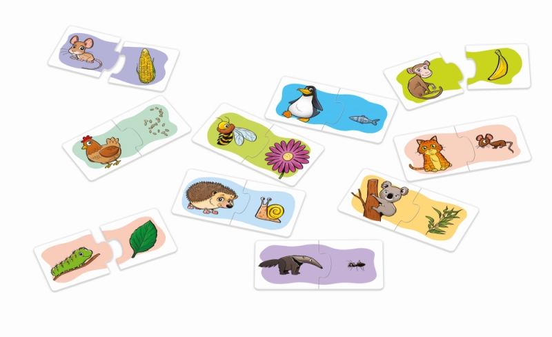 20 pevných kartiček rozdělených na poloviny s kreslenými motivy dvojic: osel + seno, lev + maso, veverka + oříšek, mravenečník + mravenec, koala + listy blahovičníku, panda + list bambusu, opice + banán, žába + moucha, včela + květ, ježek + hlemýžď, kráva + tráva, myš + kukuřice, čáp + kobylka, tučňák + ryba, stonožka + zelený keř, zajíc/králík + mrkev, pes + kost, slepice + zrní, pták + žížala, kočka + myš, dále uzavíratelný sáček + krabička s ukázkami kreslených motivů.