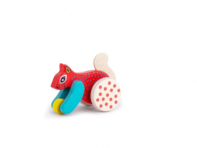 Při zatlačení skáče a napodobuje skutečné zvíře. Má plstěný ocas a v rukou drží symbolický oříšek. Dřevěná poskakující veverka má speciální mechanismus, který uvádí hračku do pohybu. Takový odkaz na realitu působí na představivost dítěte. Dítě se učí, jak se tato zvířata pohybují. Poznává jejich svět a díky tomu si jich začíná všímat a oceňovat je. Hračka také přispívá k rozvoji hrubé motoriky, zahrnuje pohyby rukou a těla.