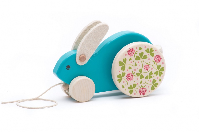 Je to králíček s velkými, květinovými koly! Může skákat. Jak je tohle možné? Hračka má jednoduchý mechanismus. Velká kola jsou těžká a jejich osa otáčení je mimo střed. To znamená, že se kolečka neotáčí ve středu, ale po obvodu kruhu. To dává efekt stoupání a klesání. Králíka je potřeba zatáhnout za provázek a pak začne poskakovat. Hračka svým charakterem a pohybovou animací působí na představivost dětí. Grafika na největších kolech buduje image louky plné trávy a květin, kde se obvykle zdržují králíci. Dítě hrající si s králíčkem poznává svět zvířat. Díky tomu si ho začne všímat a vážit si ho. Hračka také rozvíjí manuální dovednosti a přispívá k rozvoji hrubé motoriky, zahrnuje pohyby rukou a těla.