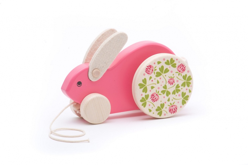 Je to králíček s velkými, květinovými koly! Může skákat. Jak je tohle možné? Hračka má jednoduchý mechanismus. Velká kola jsou těžká a jejich osa otáčení je mimo střed. To znamená, že se kolečka neotáčí ve středu, ale po obvodu kruhu. To dává efekt stoupání a klesání. Králíka je potřeba zatáhnout za provázek a pak začne poskakovat. Hračka svým charakterem a pohybovou animací působí na představivost dětí. Grafika na největších kolech buduje image louky plné trávy a květin, kde se obvykle zdržují králíci. Dítě hrající si s králíčkem poznává svět zvířat. Díky tomu si ho začne všímat a vážit si ho. Hračka také rozvíjí manuální dovednosti a přispívá k rozvoji hrubé motoriky, zahrnuje pohyby rukou a těla.