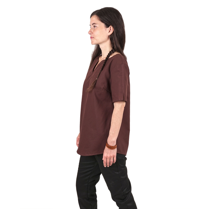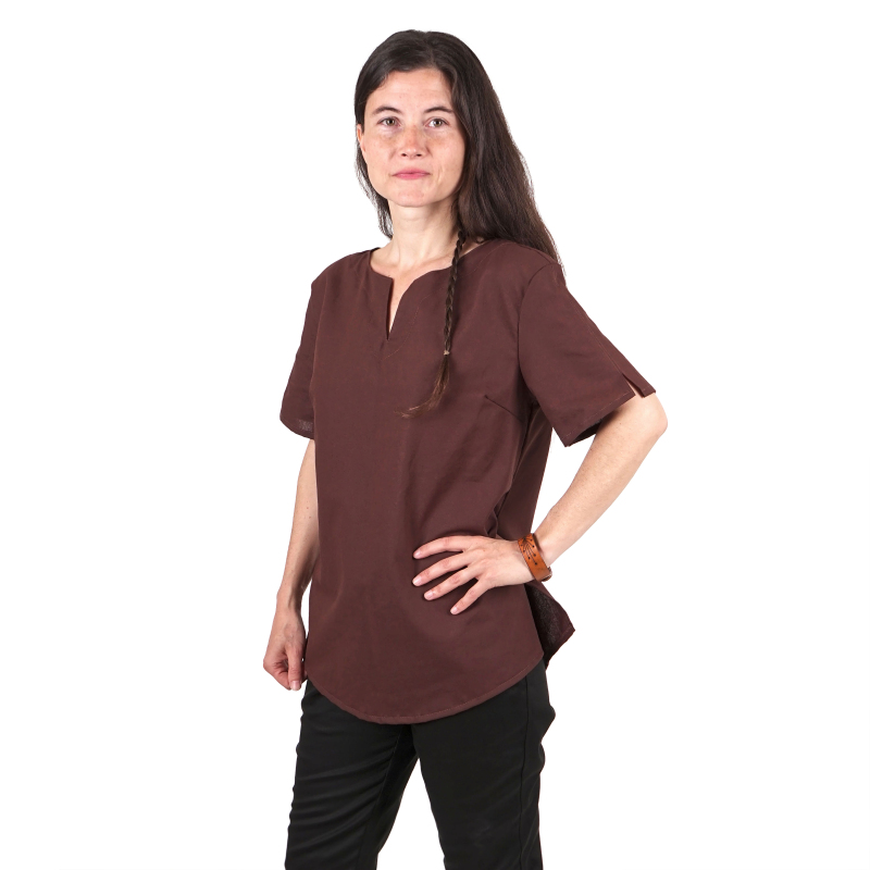 Dámská bavlněná tunika s krátkým rukávem je ideální nejen pro LARP, ale také jako základ historického či fantasy kostýmu. Kvalitní materiál (100% bavlněné plátno) a pohodlný volný střih vám poskytne maximální komfort během celého dne. Nevíte si rady, jak vyladit celý kostým? Podívejte se na naši nabídku dámských kostýmů a kožených doplňků z našeho brašnářství. Dámskou bavlněnou tuniku s krátkým rukávem nabízíme ve dvou barvách: hnědá, černá Více o použitém materiálu se dočtete zde: popis materiálů.