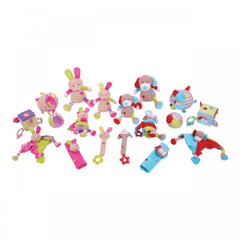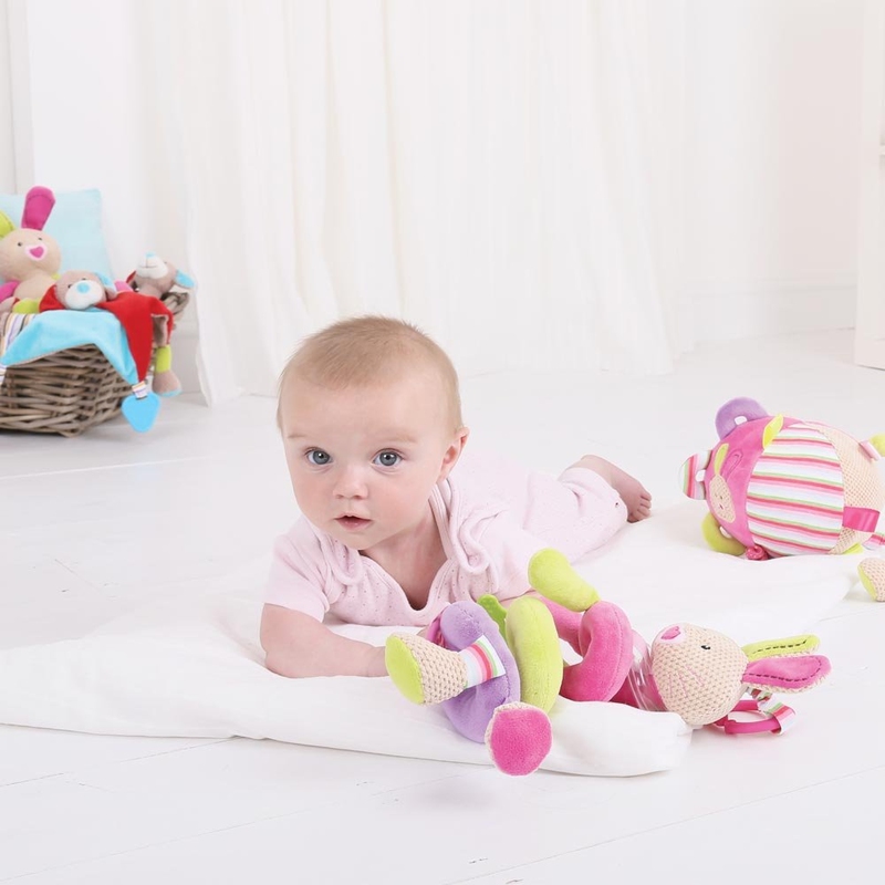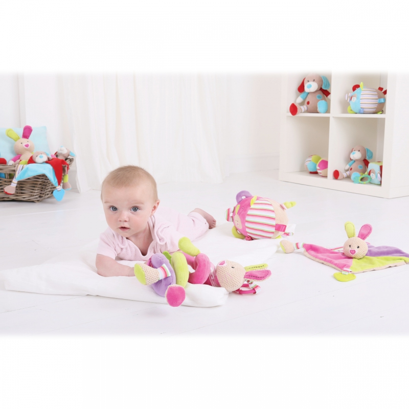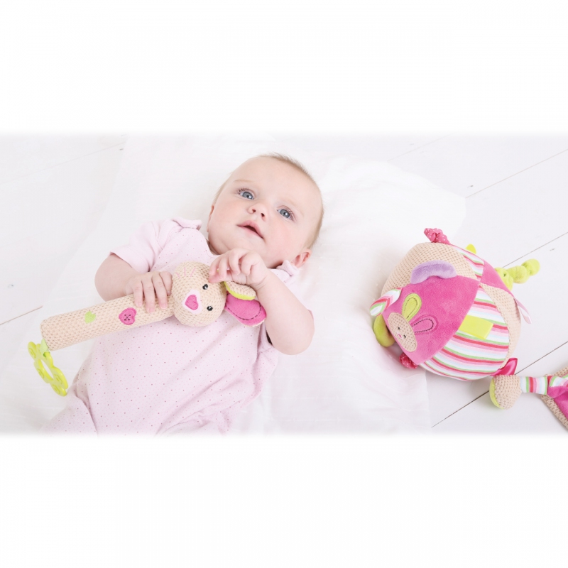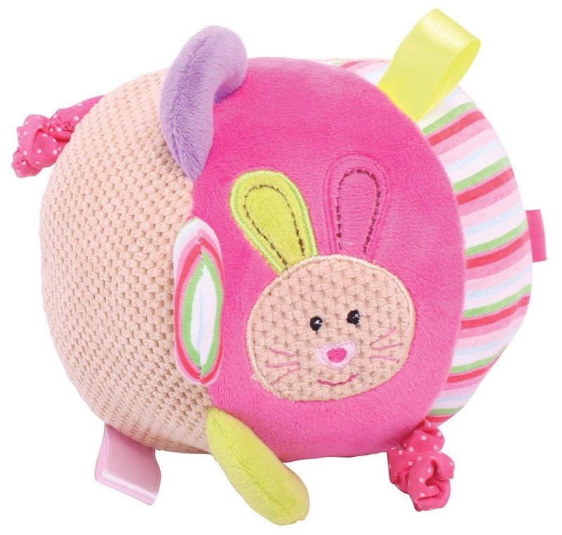 Plyšová motorická koule zajíček, která slouží jako chrastítko a lze ji připojit k postýlce nebo na kočárek. Průměr koule 17,5 cm.