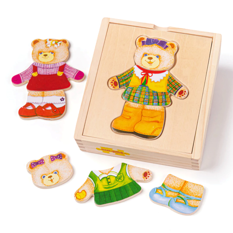 Dřevěné oblékací puzzle obsahuje celou řadu pestrobarevných dřevěných dílků, včetně oblečení a obličejů medvědice s různými výrazy. Jednotlivé díly se skládají na destičku, která zároveň slouží jako víko krabičky. Praktická krabička k uložení všech dílků puzzle. Rozvíjí schopnosti třídění a posiluje každodenní slovní zásobu. Pomáhá rozvíjet zručnost a koordinaci.