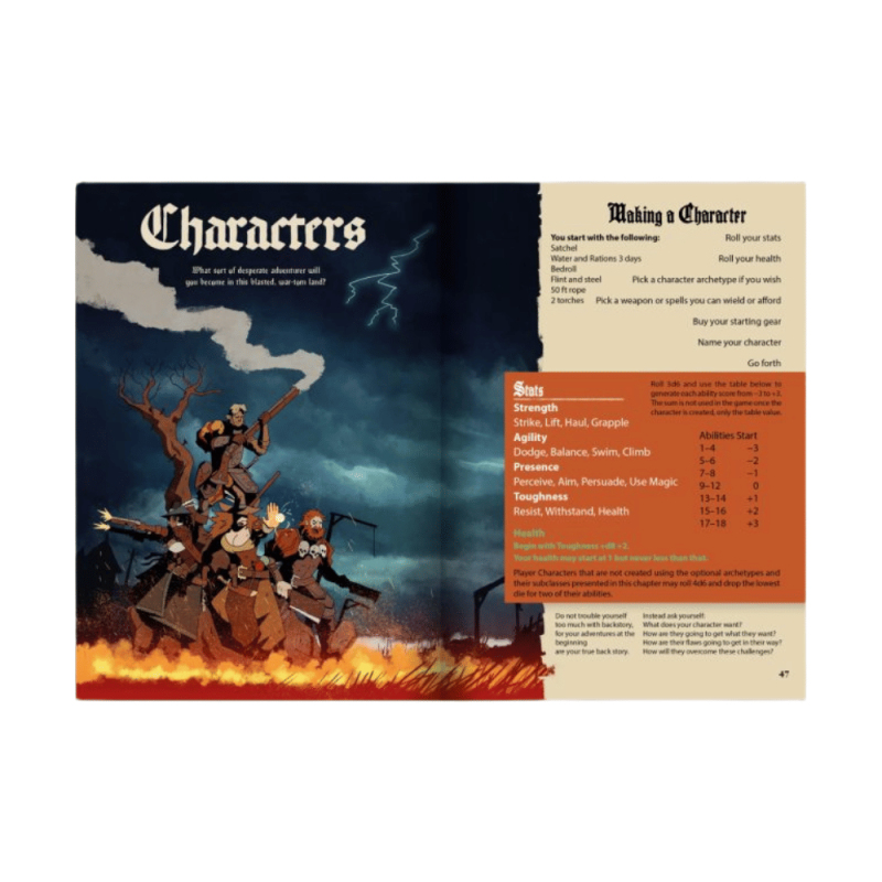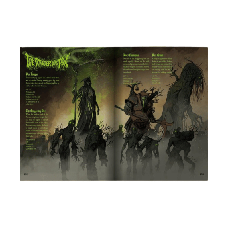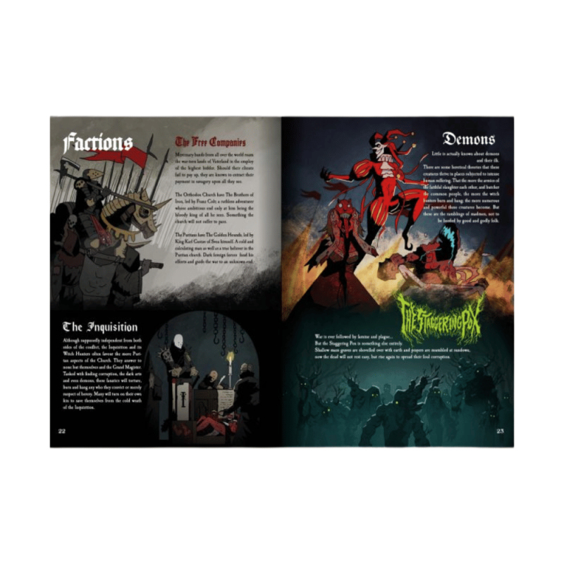 Připrav se na výbuchy magie a hřmění střelného prachu! Základní pravidla pro Black Powder and Brimstone ti otevřou dveře do nebezpečného světa fantasy divokého západu, kde se potkává klasické westernové dobrodružství s démonologií, okultismem a parní technikou. Tahle kniha je tvým průvodcem do světa lovců démonů, pistolníků i podivných vynálezců. Najdeš v ní vše potřebné – od tvorby postav, přes jedinečný systém soubojů až po magii a temné síly. Ideální pro hráče a vypravěče, kteří hledají atmosférické, akční RPG s pořádně stylovým twistem. A grimdark fantasy RPG, compatible with MÖRK BORG Embark on a dark and daring adventure where death and destruction lurks around every corner. The gunpowder and witchcraft infused game is a complete stand-alone RPG based on and compatible with the multi-award-winning apocalyptic heavy metal RPG MÖRK BORG. This action packed, rules light, art heavy OSR game offers swashbuckling adventure and gothic folk horror in an unholy blend. Key Features: A wicked cauldron of a game packed to the brim with lore, explosions, magic, war, and demons. Be a desperate adventurer stuck in the middle of the conflict desperately trying to survive, and maybe even profit, amongst the chaos and destruction. Wield unique and characterful weapons, each with their own rules and advantages on top of the damage die. Use forbidden and powerful magics that can warp reality as easily as an artist paints a canvas. A treasure chest of character options, items, locations, adventures, and enemies both human and monstrous waiting to be opened.