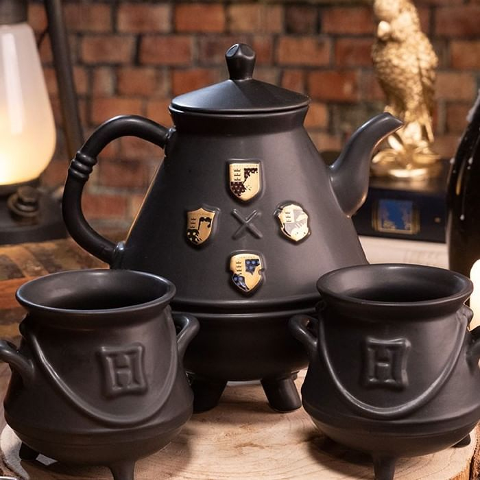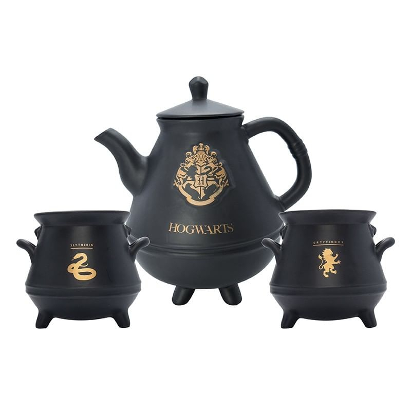 Dárková sada pro čajomilce a fanoušky magických příběhů o Harry Potterovi obsahuje krásnou černou litrovou konvici se zlatými znaky školy čar a kouzel v Bradavicích a čtveřici tamních čarodějných kolejí, dále pak pár hrnků v podobě kotlíků na lektvary - jeden se zlatým erbem Nebelvíru a druhý se symbolem Zmijozelu. Souprava není vhodná do mikrovlnky a myčky nádobí.