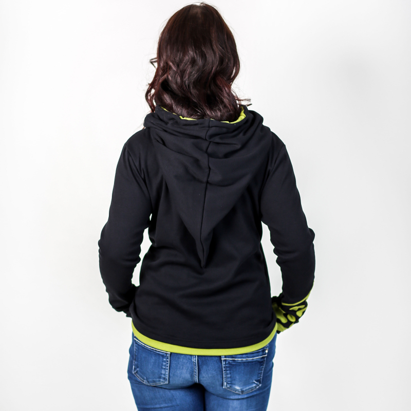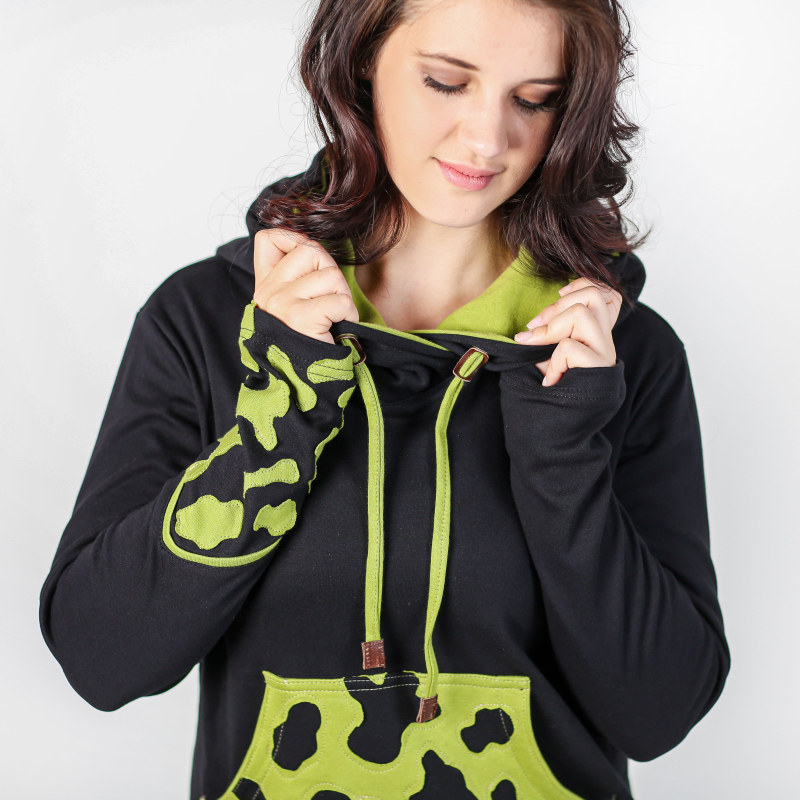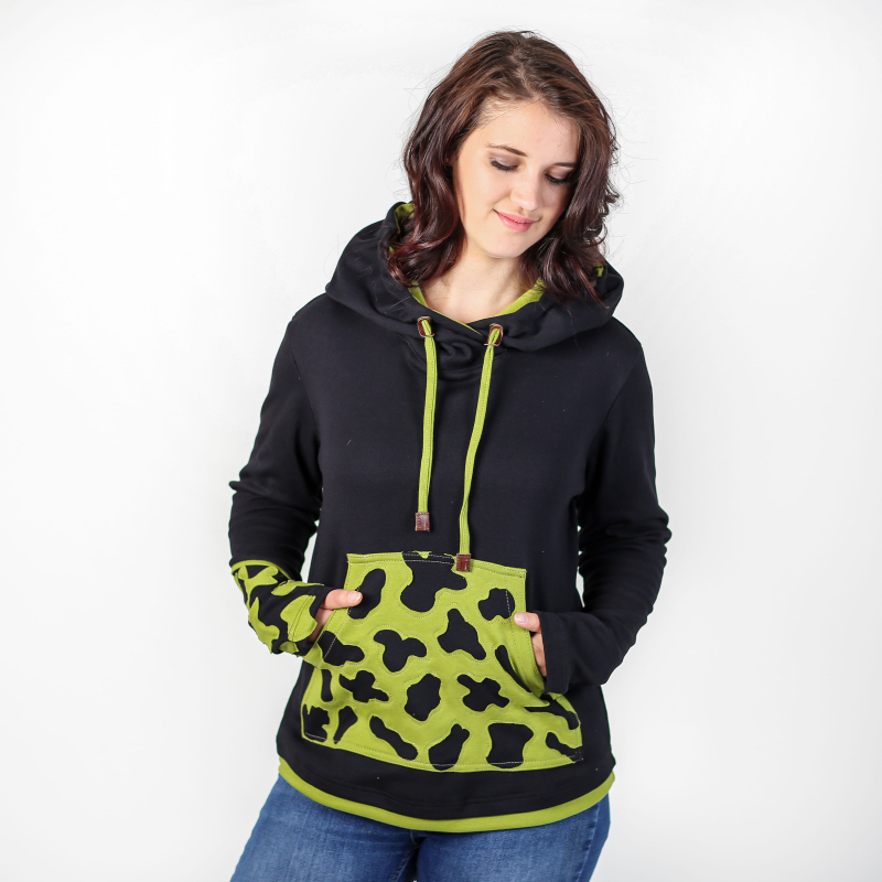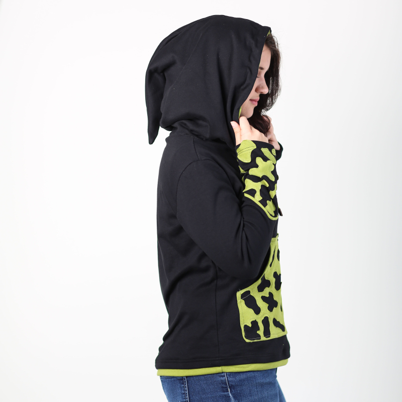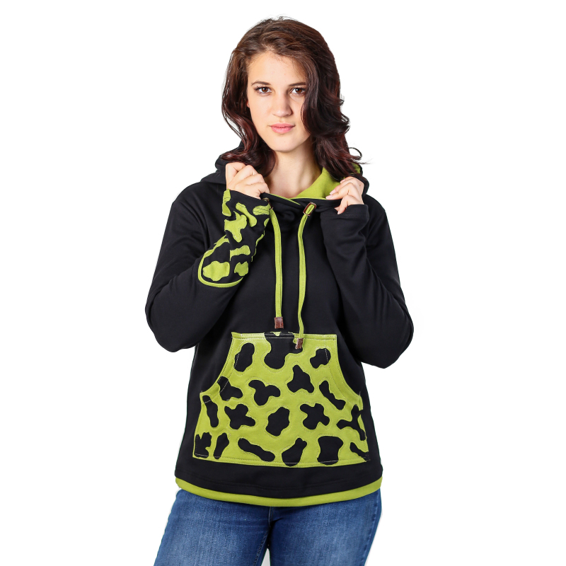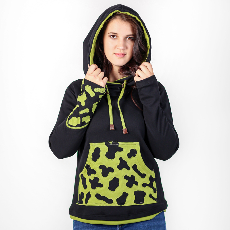 Jste doma ve městě i v přírodě? Máte rády výlety lesní i ty za trochou kultury? Naše švadlenky pro vás, hravé obojživelnice, ušily speciální dámskou mikinu, která potřeby obojživelníků respektuje: Veselé a výrazné černo - zelené zbarvení = respekt všech šediváků v širém okolí. Klokaní kapsa je poseta našitými kontrastními fleky, za které by se na svém bříšku nestyděl ani mlok. Již nemusíte zalézat pod kameny a pod listí. Stačí zahalit svou tvář a hlavu plnou nápadů do prostorné špičaté kapuce se stahováním na šňůrku. Bacha na citlivou pokožku mloků a žab! Tato mikina neublíží vám ani vašemu okolí, je totiž z velice příjemné biobavlny. Prohlédněte si i další barevnou variantu tribal mikiny Skamandra: zeleno - oranžovou. Více o použitém materiálu se dočtete zde: popis materiálů.