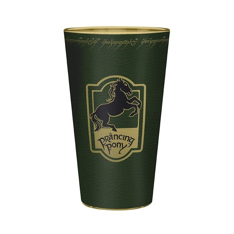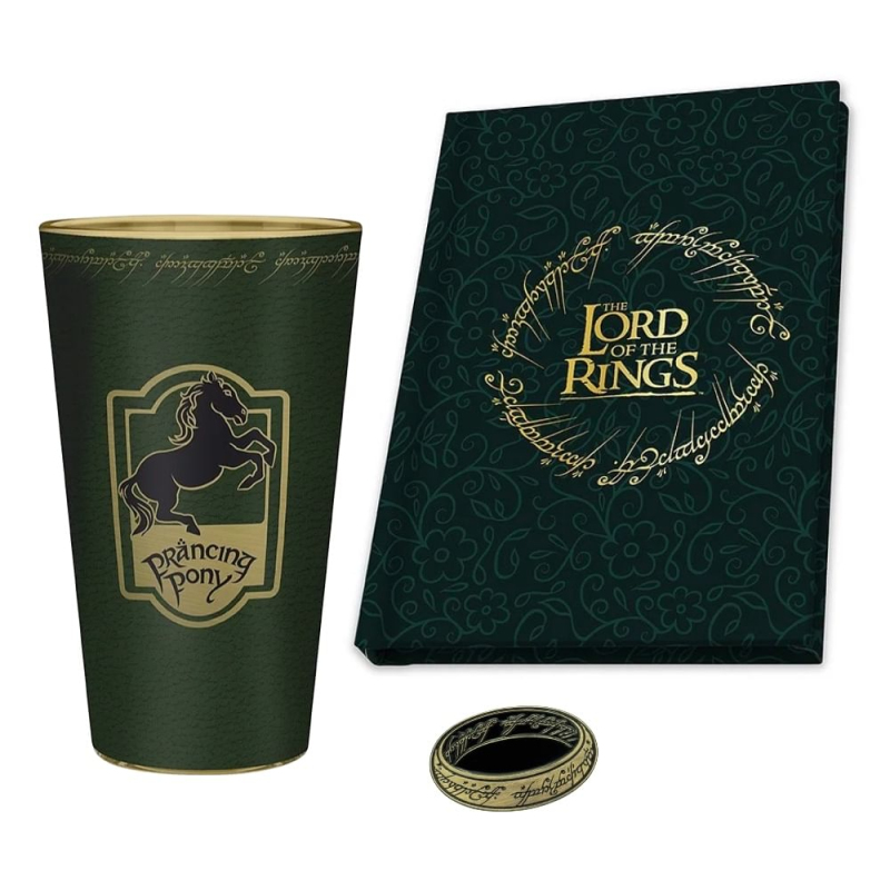 S dárkovou sadou pro milovníky fantasy trilogie Pán prstenů získáte hned trojici jedinečných předmětů s motivem Prstenu moci: sklenici, kterou také zdobí vývěsní štít hostince U Skákavého poníka v Hůrce, kovový odznak v podobě Jednoho prstenu a krásný linkovaný zápisník v pevných deskách, který zve k sepsání vašich vlastních příběhů.