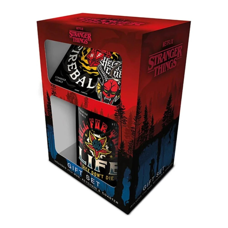 V dárkové sadě pro fanoušky oblíbeného seriálu Stranger Things najdete pěkný keramický hrnek, gumovou klíčenku a korkový podtácek - to vše s motivy Hellfire Clubu. Vše je baleno v hezké dárkové krabičce.