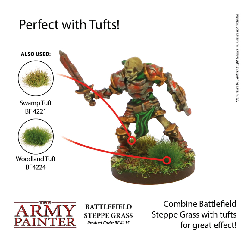 Balení Steppe Grass obsahuje posyp od společnosti Army Painter, který je vhodný pro výzdobu podstavců miniatur a modelů. Posyp je ve třech různých velikostech, takže je vhodný opravdu pro jakýkoliv typ podstavce. Posyp může být barven pro dosažení dalších efektů, vhodné kombinovat s tufty Army Painter či dalším materiálem pro vytváření podstavců.