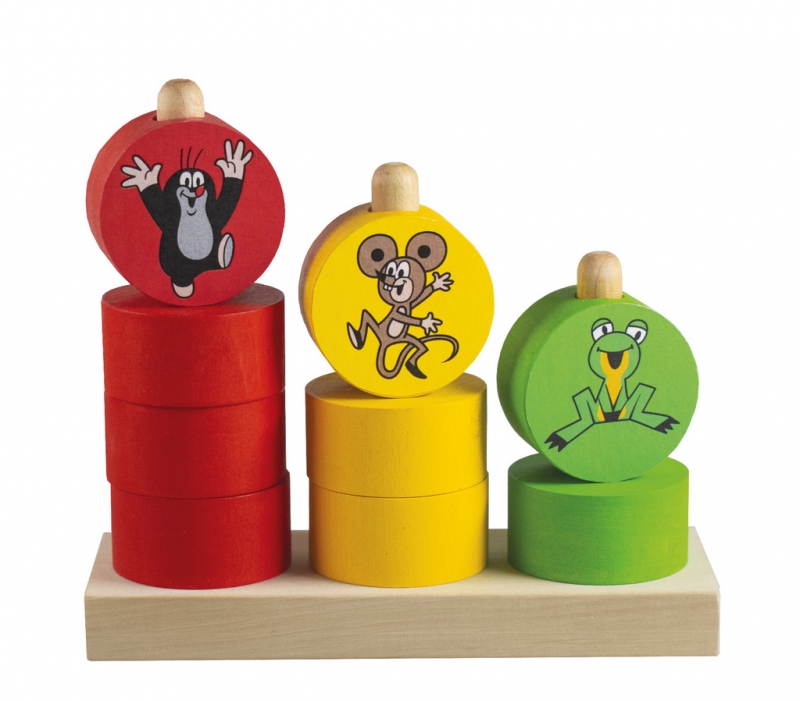 Veselé pyramidy se skládají z 12 navlékacích dílů a jednoho základního dílu se třemi tyčkami. Skládací pyramida pomáhá rozvíjet motoriku rukou a představivost dítěte.