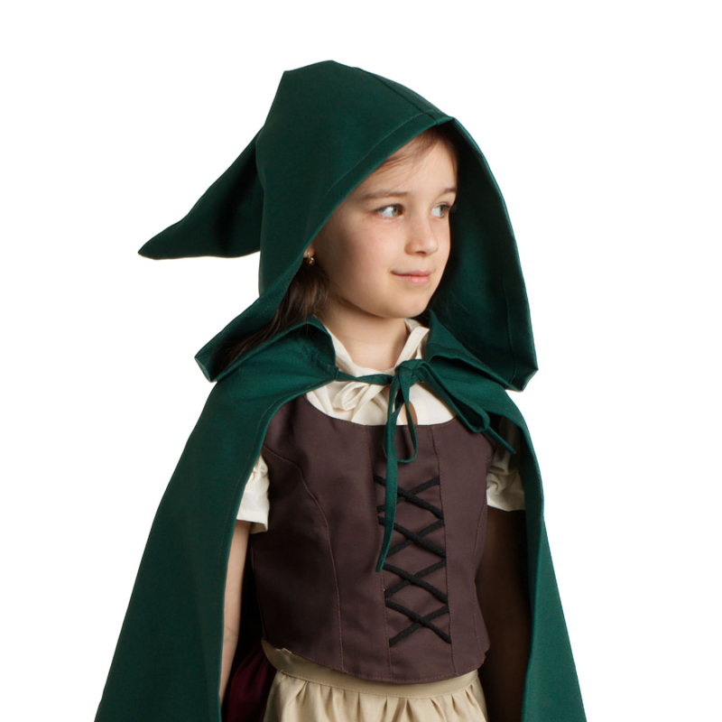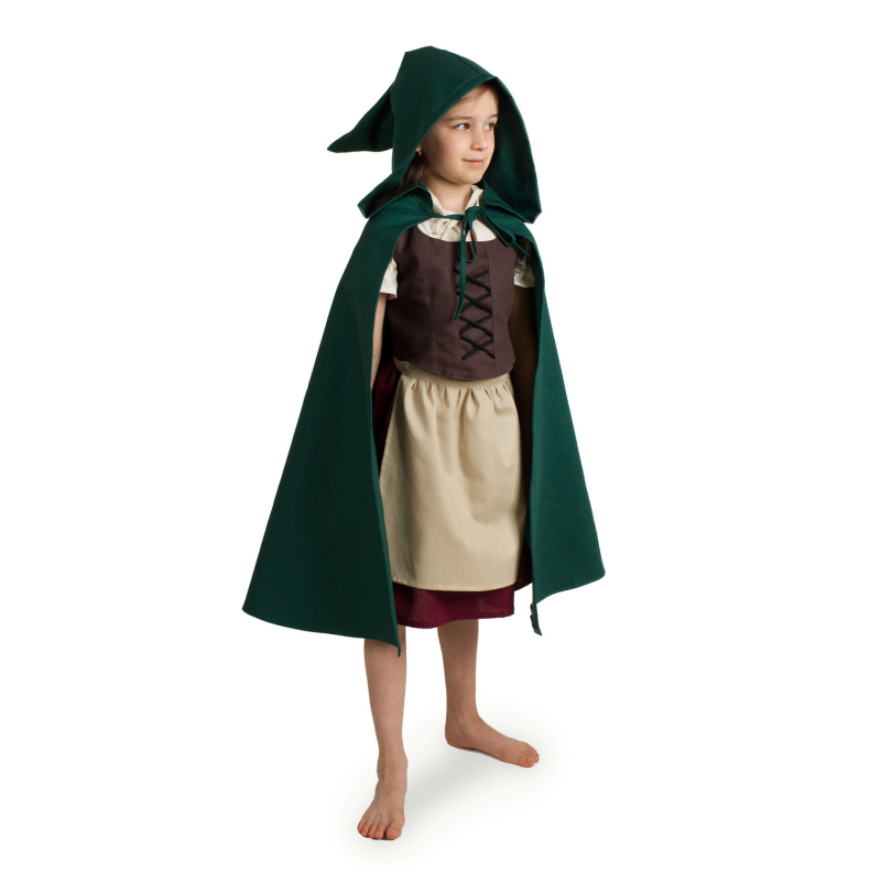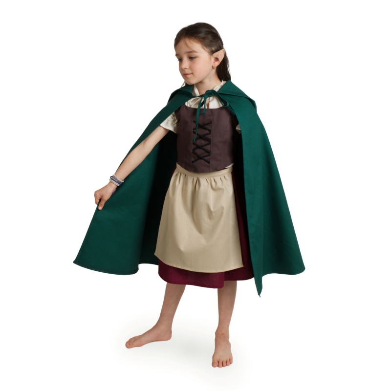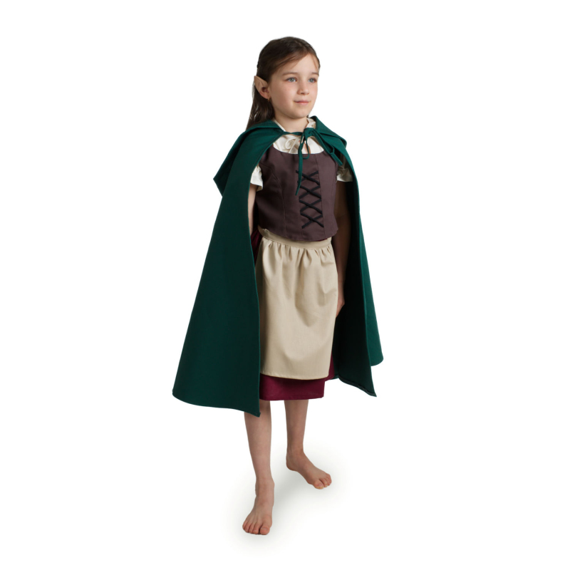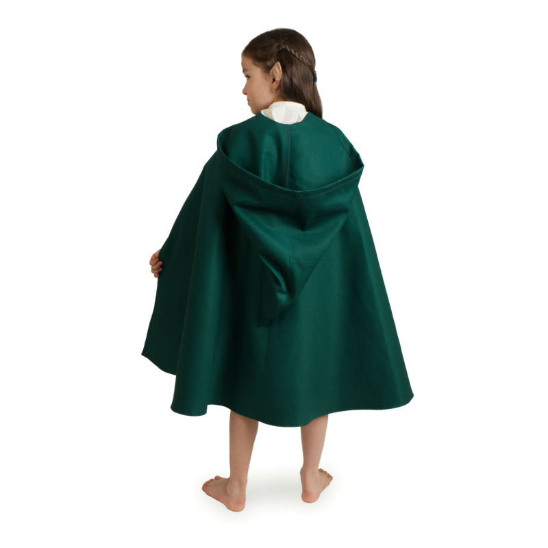 Dětský plášť Hobit v tmavě zelené barvě, z pevné bavlněné látky (kepr) ušitý v naší dílně padne vašemu hobitkovi či hobitce jako ulitý. Praktická šňůrka na zavazování pod krkem udrží plášť na svém místě. Díky své délce, kterou nosili hobiti, je praktický při všech hrách či bojích. Ani ten nejmenší hobit se nemusí bát, že by si šlapal na svůj plášť. Dětský pláštík šijeme také v dalších barvách: hnědý, šedý, černý a vínový. Pláště jsou ve čtyřech velikostech, délka je měřena od krku na zadním díle (bez kapuce): 122/128 - délka 78 cm 134/140 - délka 88 cm 146/152 - délka 98 cm 158/164 - délka 108 cm