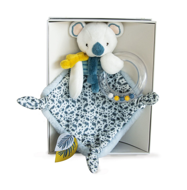 Plyšová koala Yoca doprovází miminko od narození, aby mu přinesla hebkost, pohodlí a objetí. Chrastítko zaujme miminko díky zvukům malých kuliček uvnitř kroužku. Je to velmi pěkný dárek k Vánocům nebo k oslavě narození miminka. Je extrémně měkká a příjemná na dotek. Rozkošná koala s usínáčkem je posazená do nádherné dárkové krabičky s grafikou evokující modernost i luxus.