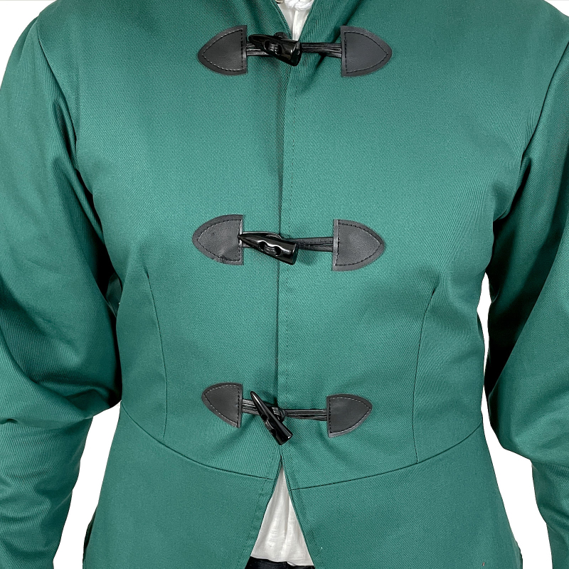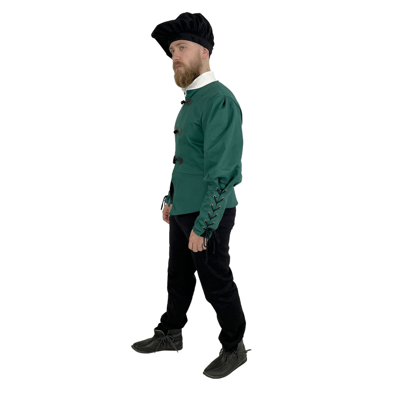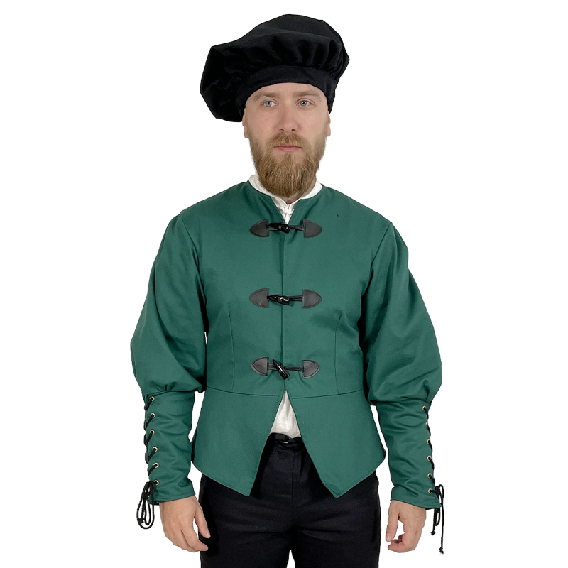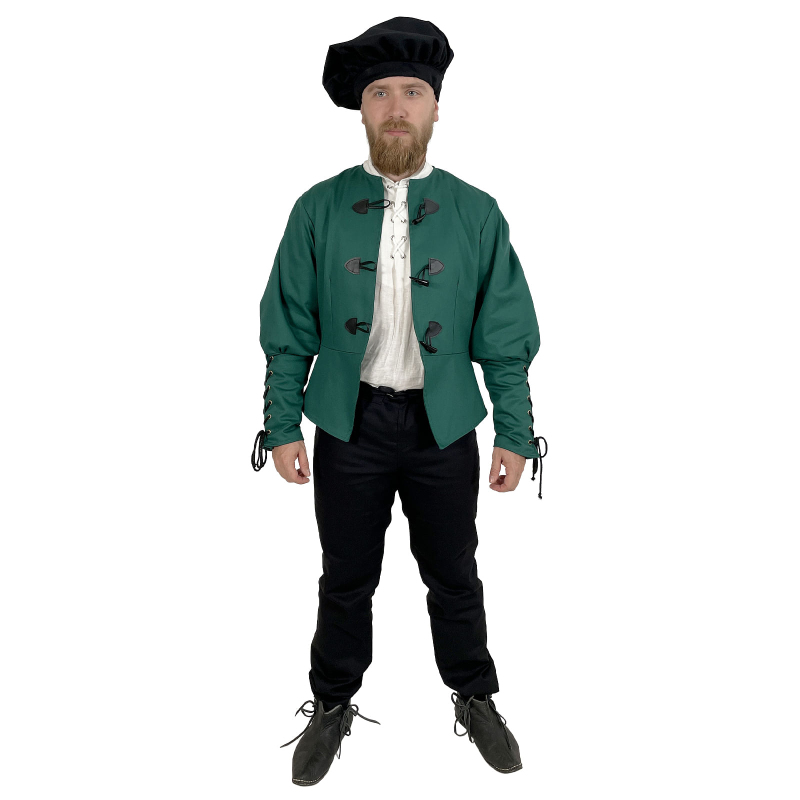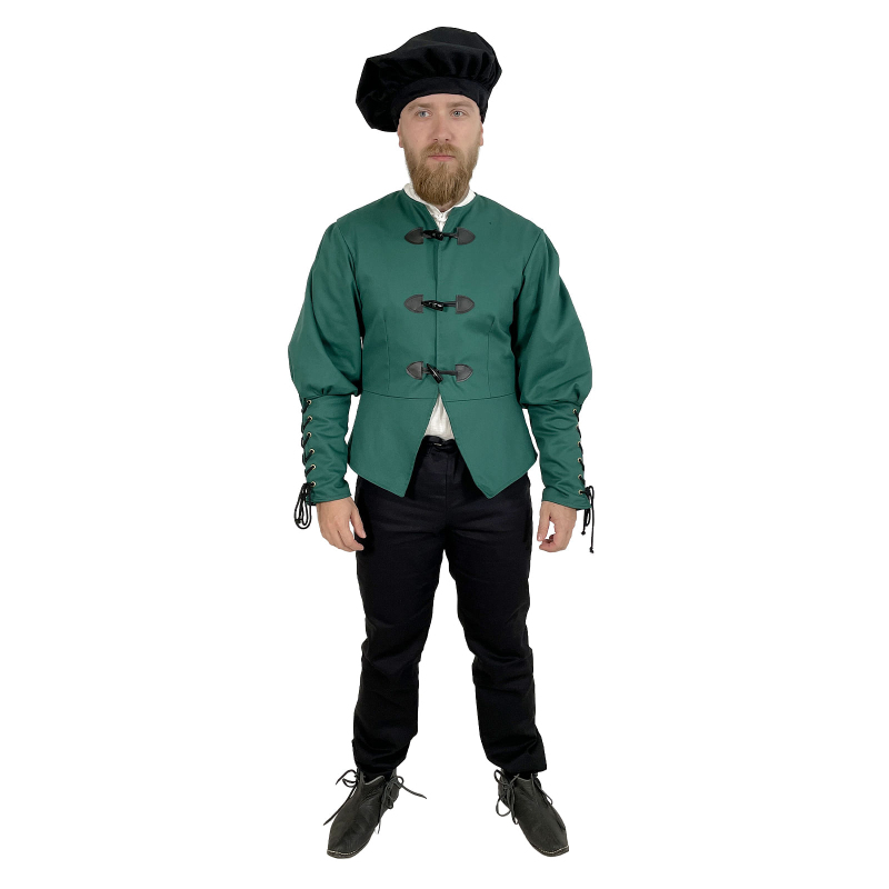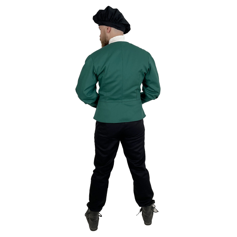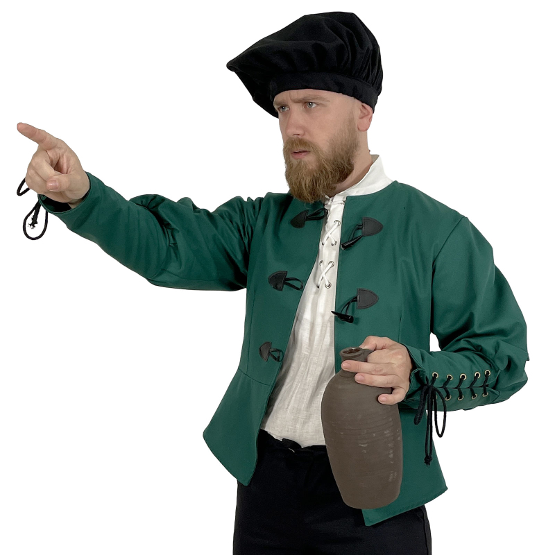 Dublet pro měšťany – Donatello je poctivě zpracovaný zelený kabátec inspirovaný dobovým oděvem městského obyvatelstva pozdního středověku a raného novověku. Tento dublet vyrábíme výhradně v naší dílně – každý kus od základu navrhujeme s důrazem na detail a funkčnost. Základem je pevný kepr (plátnová bavlněná tkanina s jemnou strukturou), podšitý, a to pro větší pohodlí a lepší padnutí. Má elegantní, ale ne přehnaně okázalý střih, který vyhovuje postavám měšťanů, řemeslníků, písařů, cechovních mistrů nebo postav z bohatších vrstev nižší šlechty. Díky praktickému zapínání vpředu, pevnému provedení a neutrální červené barvě je dublet ideální pro kombinaci s dalšími vrstvami oděvu. Hodí se na historické slavnosti, larpové bitvy, fantasy akce, jako divadelní kostým a k dalším příležitostem.