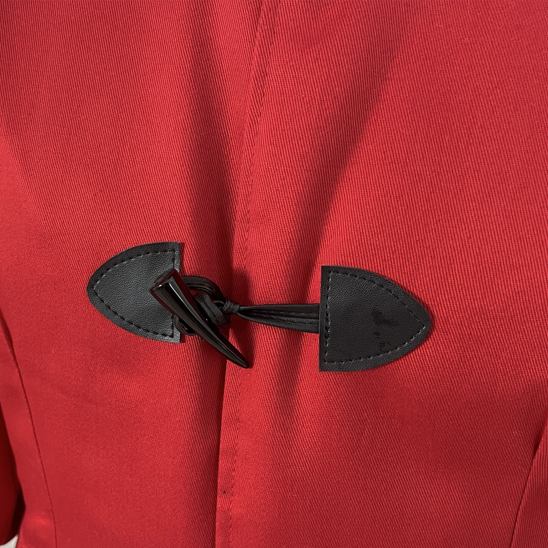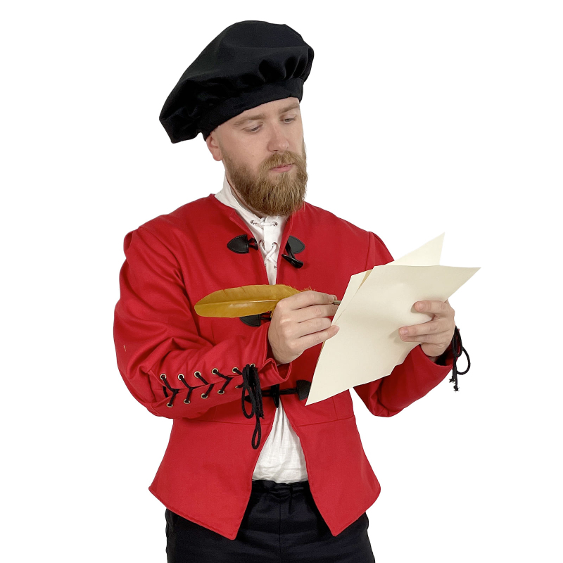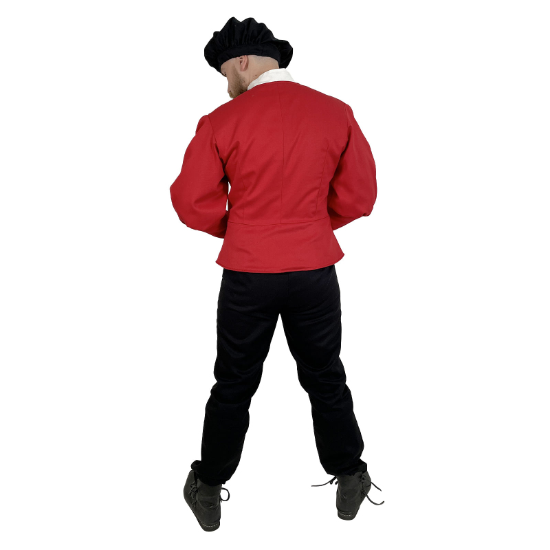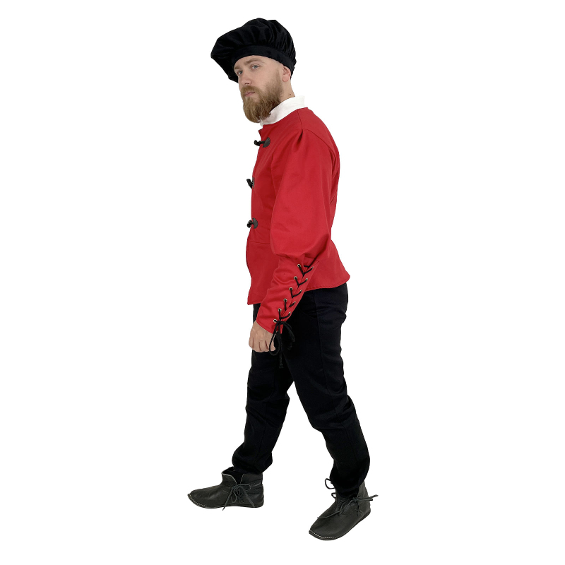 Dublet pro měšťany – Raffael je poctivě zpracovaný červený kabátec inspirovaný dobovým oděvem městského obyvatelstva pozdního středověku a raného novověku. Tento dublet vyrábíme výhradně v naší dílně – každý kus od základu navrhujeme s důrazem na detail a funkčnost. Základem je pevný kepr (plátnová bavlněná tkanina s jemnou strukturou), podšitý, a to pro větší pohodlí a lepší padnutí. Má elegantní, ale ne přehnaně okázalý střih, který vyhovuje postavám měšťanů, řemeslníků, písařů, cechovních mistrů nebo postav z bohatších vrstev nižší šlechty. Díky praktickému zapínání vpředu, pevnému provedení a neutrální červené barvě je dublet ideální pro kombinaci s dalšími vrstvami oděvu. Hodí se na historické slavnosti, larpové bitvy, fantasy akce, jako divadelní kostým a k dalším příležitostem.