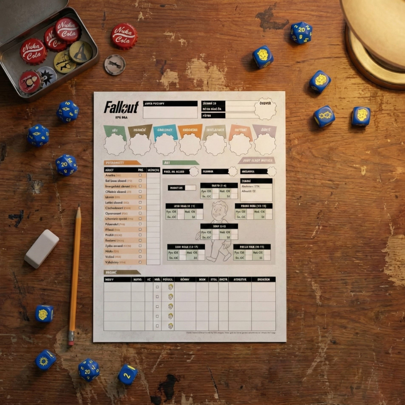 Arch obsahující celkem 10 deníků pro záznamy o postavě do hry na hrdiny Fallout. Pět karet je určeno pro postavy s lidskou anatomí, zbylých pět je pro anatomii robota. Deníky jsou oboustranné, jsou shodné s předlohou, která je součástí pravidlové příručky.