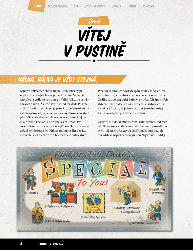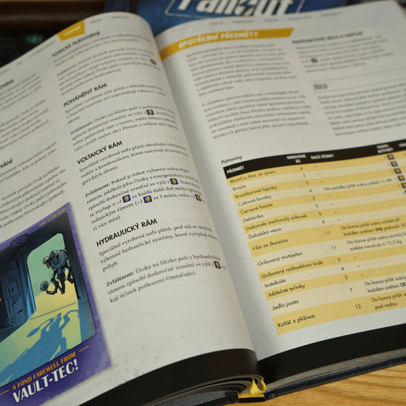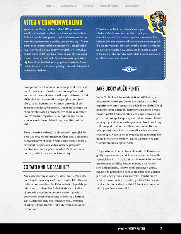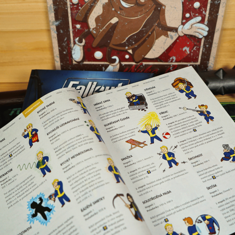 Ponoř se do ikonického světa Falloutu, prozkoumej Pustinu a vytvářej vlastní příběhy o přežití v post-nukleární Americe. Objev svět po fatální jaderné válce Vítej ve světě Falloutu, ikonické postapokalyptické budoucnosti zasazené do retro-futuristických padesátek. Teď máš šanci stát se součástí tohoto světa díky oficiálnímu stolnímu RPG od Modiphius Entertainment. Vydej se z bezpečí Vaultu, prozkoumávej radioaktivní Pustinu, potkávej frakce i podivné tvory a napiš svůj vlastní příběh o přežití v zemi, kterou změnila atomová válka. Zažij Fallout naživo díky systému 2d20 Herním srdcem je systém 2d20, vytvořený pro svižné a příběhově orientované hraní. Házej dvěma dvacetistěnkami, využívej Akční body a Perky, které znáš z videoher, a ovládej osud svého hrdiny. Nechybí samozřejmě ani legendární systém S.P.E.C.I.A.L., takže se při hře cítíš přesně jako ve Falloutu. V pravidlech najdeš kompletní nástroje pro tvorbu postavy – můžeš hrát za člověka, ghúla, supermutanta nebo robota. Čeká tě rozsáhlý bestiář, ikonické vybavení, craftování i úpravy zbraní, které znáš ze hry. Jako Game Master oceníš generátory náhodných setkání, lokací a úvodní dobrodružství, díky kterým se můžeš rovnou pustit do hraní. Pro koho je Fallout RPG ideální Pokud miluješ videoherní Fallout, tady máš možnost prožít ho naživo se svou partou. A i když jsi do Pustiny nikdy nevkročil, hra tě vtáhne díky napínavým příběhům, morálním dilematům a boji o přežití. Fallout RPG ti dá prostor stát se hrdinou – nebo padouchem – ve světě, kde každý tvůj krok může rozhodnout o životě a smrti. Co v příručce najdeš: Pravidla pro vytváření a hraní postav včetně lidí, ghoulů, supermutantů a robotů Systém 2d20 určený pro dynamické příběhově orientované hraní Rozsáhlý bestiář z univerza Fallout Craftování, modifikace zbraní a využívání ikonických předmětů ze hry Nástroje pro Gamemastery včetně generátorů náhodných setkání a lokací Úvodní dobrodružství
