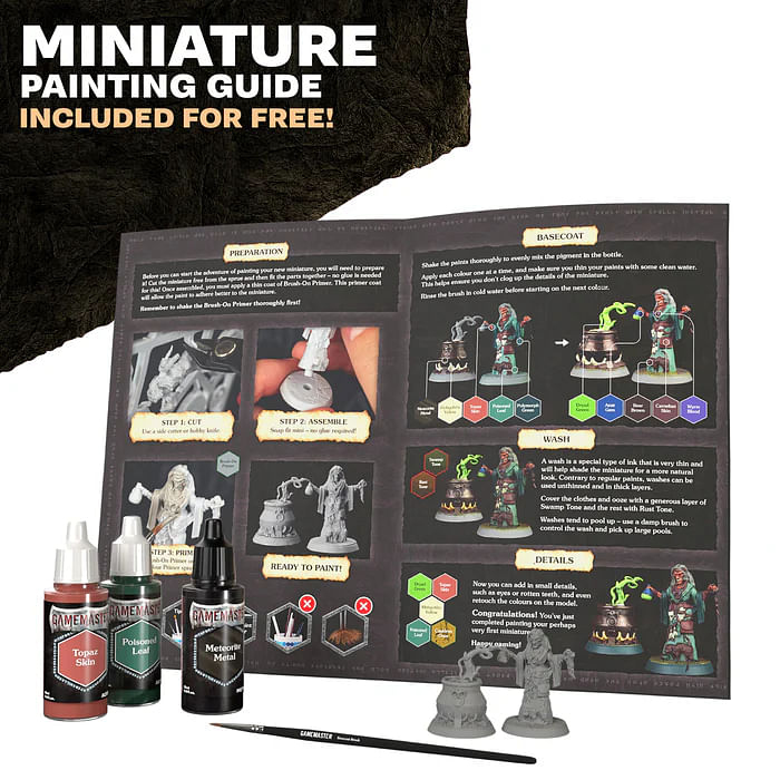 Sada Gamemaster: Wilderness Adventures - Role-playing Paint Set od společnosti Army Painter obsahuje 1 fantasy miniaturu čarodějnice, 14 barev s míchacími kuličkami, Brush-On Primer, štětec a příručku - vše potřebné, abyste se mohli pustit do barvení - ať už začínáte nebo se tomuto koníčku věnujete už déle! Obsah balení: 1 miniatura čarodějnice 15 Warpaints FanaticTM (každá o objemu 18ml) 1 štětec Drybrush 1 průvodce malováním Warpaints FanaticTM: Dryad Green, Polymorph Green, Poisoned Leaf, Aesir Gem, Fire Dragon, Wyrm Blood, Hobgoblin Yellow, Bear Brown, Carnelian Skin, Topaz Skin, Meteorite Metal, Swamp Tone, Rust Tone, Cauldron Ooze a Brush-On Primer.