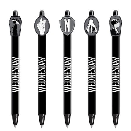 S tímto stylovým gumovacím perem s motivy od seriálu Wednesday získá tvůj penál zcela nový rozměr! Bude temný a elegantní. Ať už si do deníku zapisuješ podivné myšlenky, plánuješ pomstu svým spolužákům nebo jen potřebuješ strašlivě dobré psací potřeby do školy, tohle pero tě rozhodně nezklame. Pero píše modrým gelovým inkoustem, který můžeš kdykoli vymazat pomocí gumovací koncovky. Zmizí jako nic, už žádné škrtání, žádné chyby! Pero má 5 různých designů, každý s vlastním temným kouzlem. Ty obdržíš náhodně vybraný kus. Protože překvapení, jsou nejlepší.