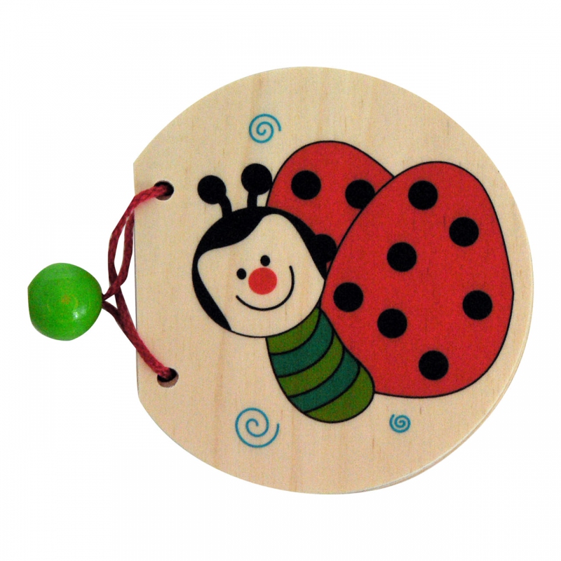 Knížka svázaná šňůrkou opatřenou korálkem obsahuje sadu ikonických obrázků zvířátek a jarních motivů. Listy z odolného bukového dřeva nabízí kvalitní, hladkou povrchovou úpravu a jsou zdobeny výhradně ekologickými a nezávadnými barvami. Vyrobeno v Německu, ze dřeva z německých lesů.
