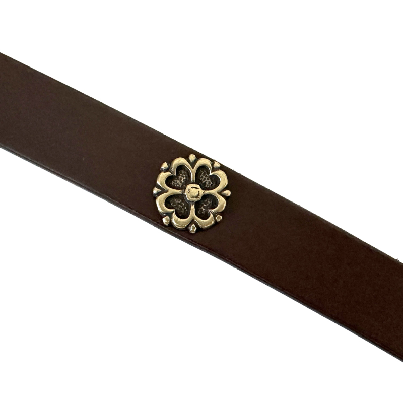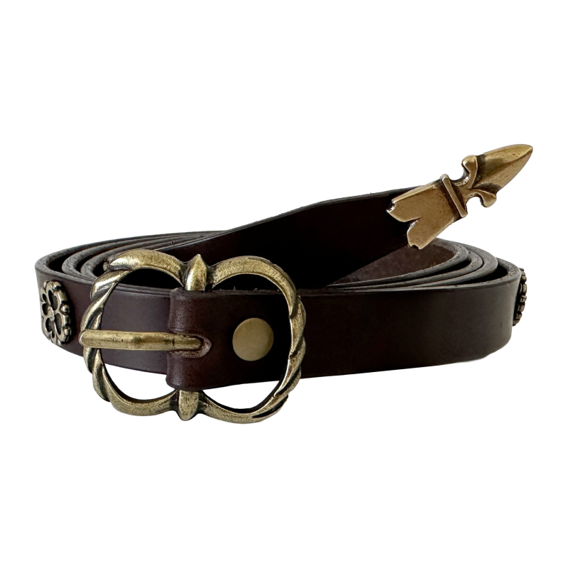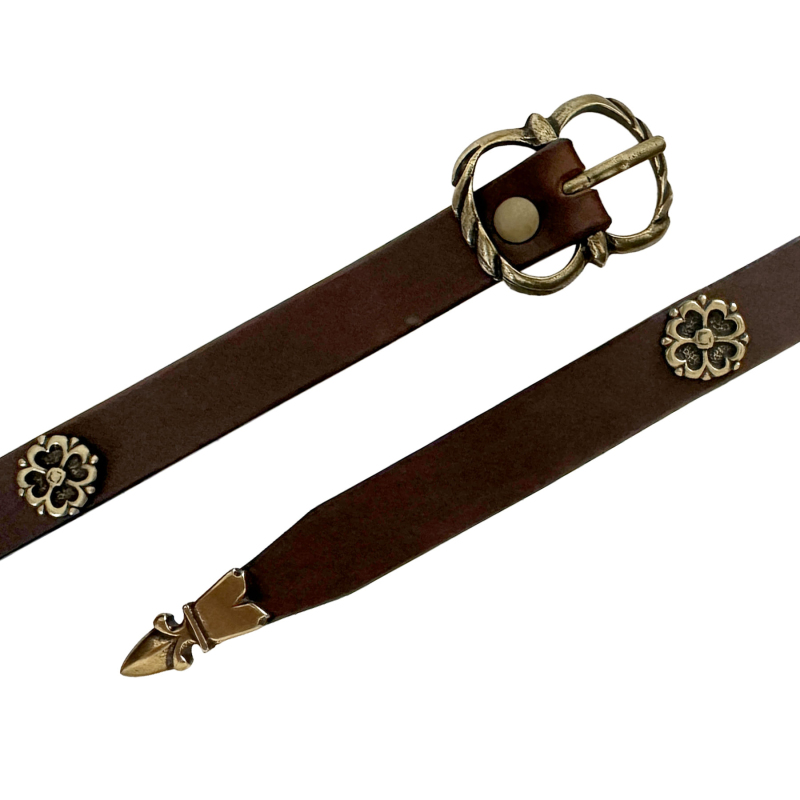 Doplň svůj středověký či historický kostým autentickým opaskem inspirovaným 14.–15. stoletím. Tento hnědý kožený pásek je v tenkém stylu, typického pro nošení k tunikám nebo šatům, a je zakončen mosazným zdobením ve zlaté barvě. Mosazné dekorace jsou zdobeny motivem čtyřlístku, připomínajícím autentické exempláře z pozdního středověku. Díky decentnímu a elegantnímu provedení je pásek nejen stylový, ale i praktický pro kostým či historické rekonstrukce. Skvělý doplněk pro LARP, tématické festivaly nebo historické kostýmy! Rozměry pásku jsou - šířka 2 cm, tloušťka 0,3 cm a délka je cca 166 cm.