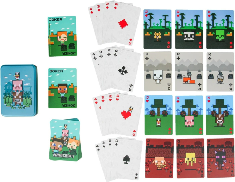 Uvnitř hezké a praktické plechovky najdeš hrací karty se zvířátky a dalšími postavami z kostičkového světa videohry Minecraft. Zahraj si svou oblíbenou karetní hru, ať už doma s rodinou nebo třeba na cestách s přáteli! V krabička obsahuje 52 karet (+2 žolíci).