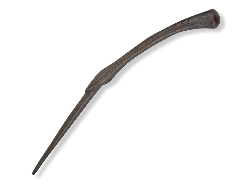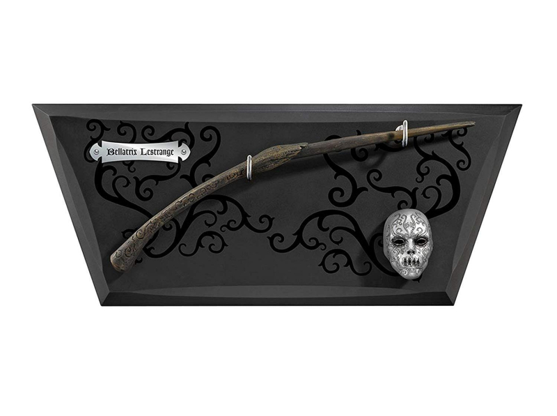 Replika kouzelnické hůlky smrtijedky Bellatrix Lestrangeové v zahnutém provedení. Hůlka je dlouhá cca 35 cm, vyrobena ze syntetické pryskyřice. Součástí je stylový držák na stěnu s miniaturou masky smrtijeda.
