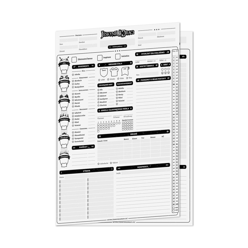 Praktický deník – karta postavy pro českou fantasy hru na hrdiny Jeskyně a draci. Karta obsahuje 4 stránky formátu A4, tištěná je na papír velikosti A3 přeložený napůl. V kartě naleznete vše potřebné pro záznam o vaší postavě.