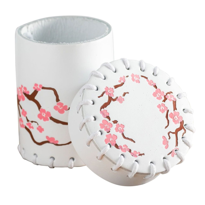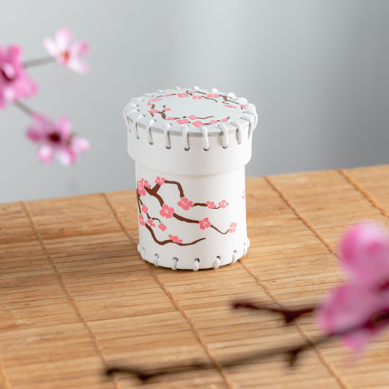 Krásný kožený kelímek na kostky v japonském stylu zdobí květy sakury. Dopřejte svým kostkám orientální krásu a eleganci!