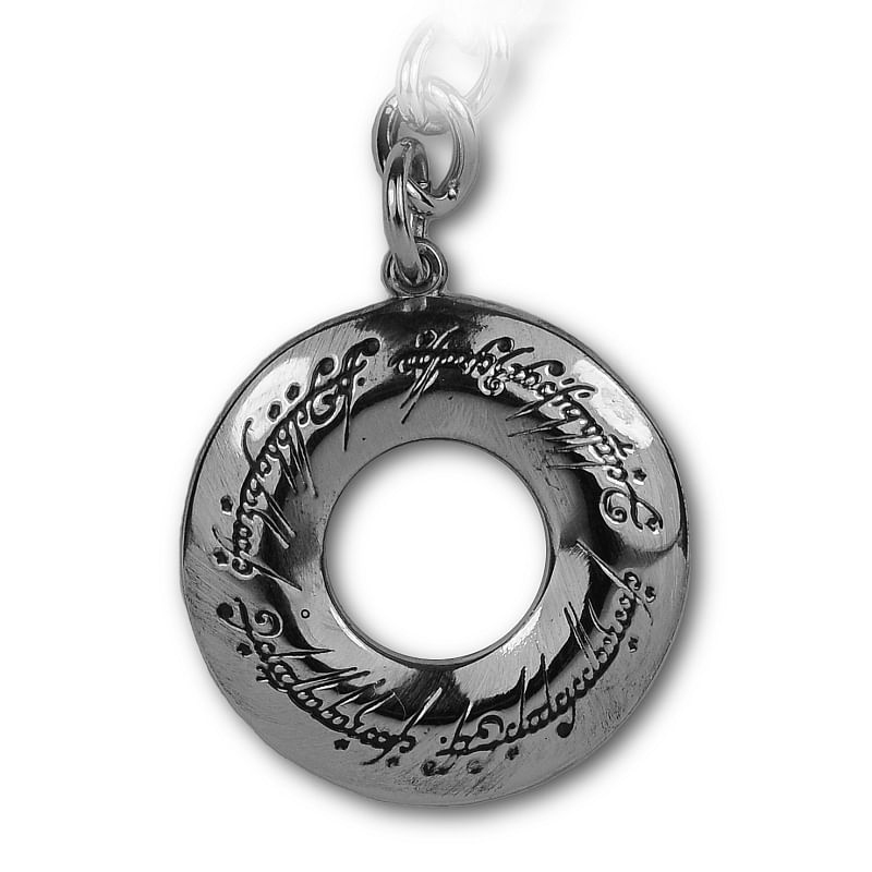 Přívěsek na klíče, stylizovaná podoba jednoho prstenu - kovový kroužek s vyrytými znaky.