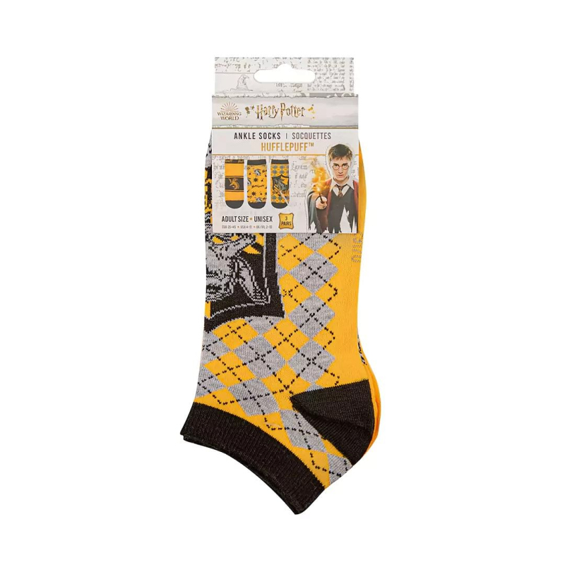 Sada obsahuje 3 páry kotníkových ponožek pro čarodějky a mágy z Mrzimoru, koleje z bradavické školy čar a kouzel. Originální doplněk oblečení či kostýmu pro fanoušky příběhů o Harry Potterovi. Ponožky mají jednu univerzální velikost (US 4-11 / EU 35-45 / UK/IRL 2-10).