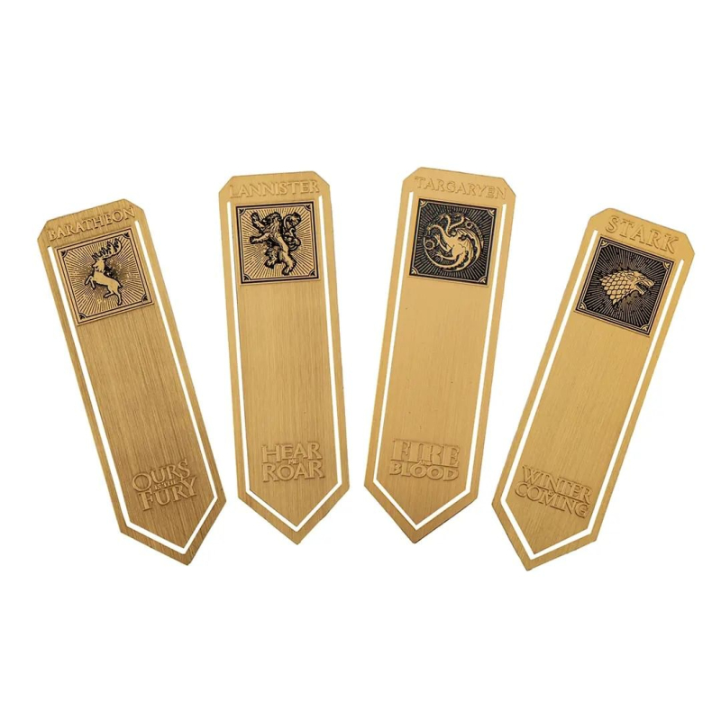 Sada obahuje 4 kovové záložky se znaky rodů Starků, Targaryenů, Lannisterů a Baratheonů z oblíbené fantasy řady Game of Thrones. Záložky, které si čtenáři Hry o trůny zamilují! Rozměry jedné záložky jsou cca 10 x 3 cm.