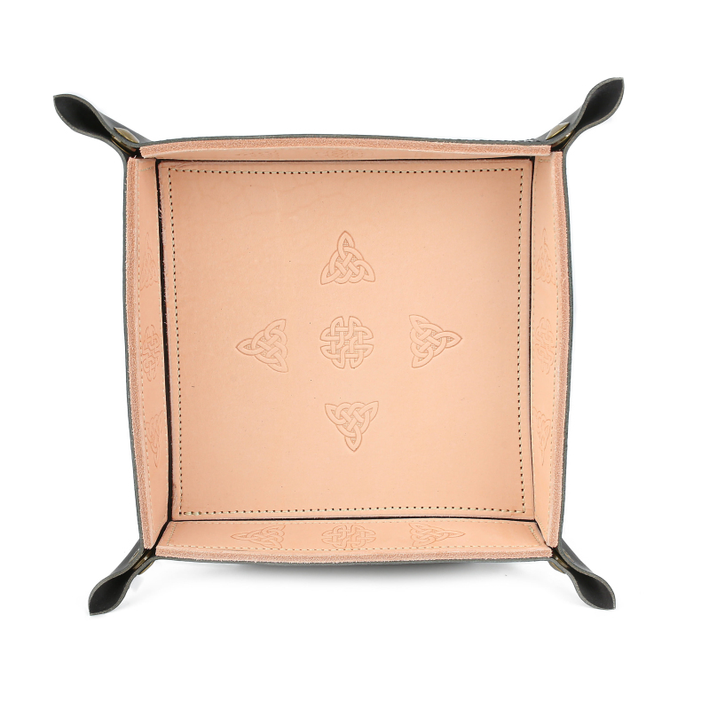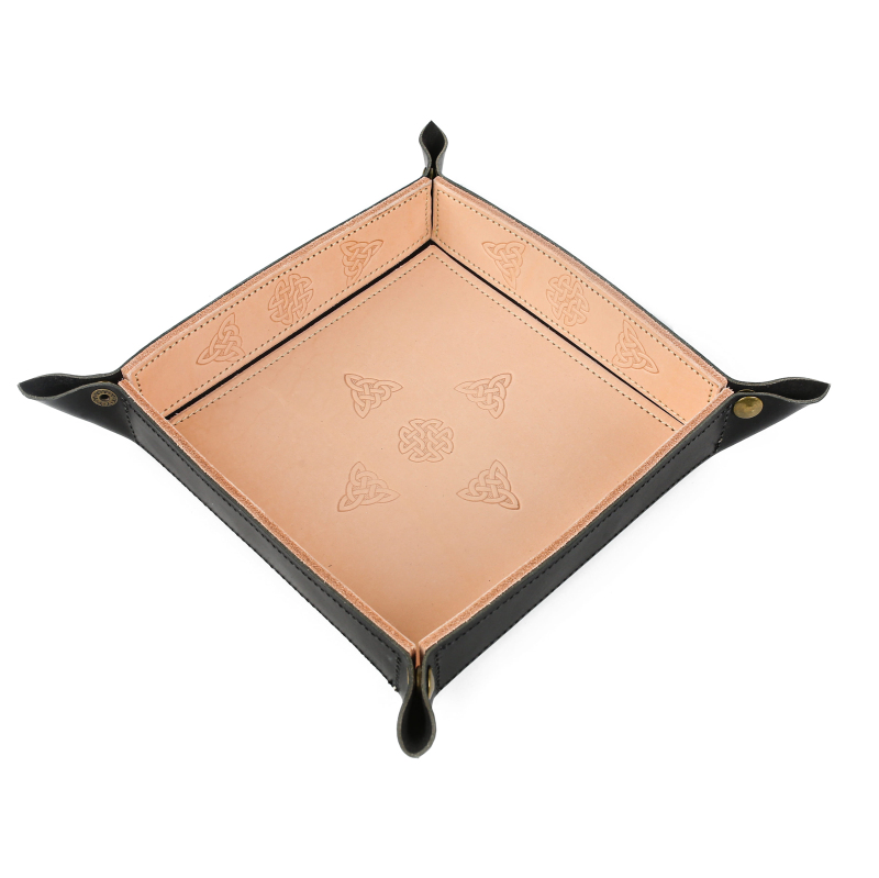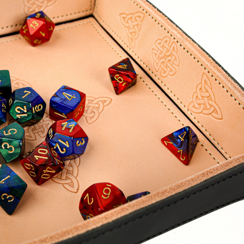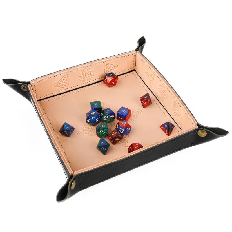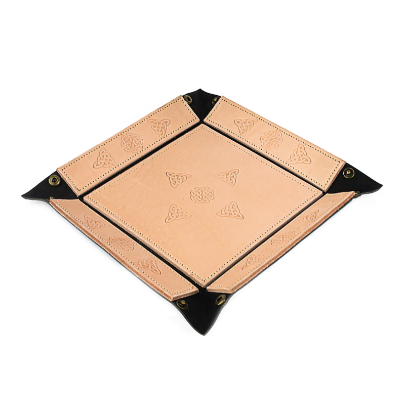 Skládací kožená podložka na házení kostek neboli dice tray. Hodí se všude tam, kde se hází kostkami. Díky podložce vám kostky nelétají všude po stole, máte je vždy při ruce a hozený výsledek je pěkně čitelný. Tato varianta podložky je vyrobena ručně v naší dílně, kůže je zdobená vytlačovanými keltskými motivy. Složená podložka má rozměry 19 x 19 cm, výška okraje je 4 cm. V rozloženém stavu je velikost 25 x 25 cm.