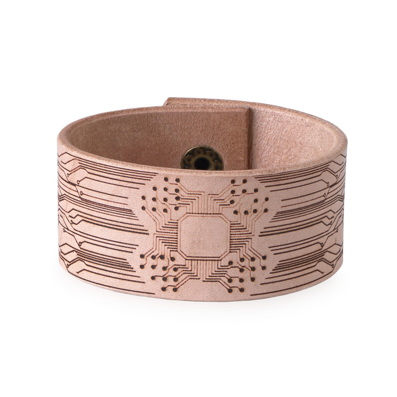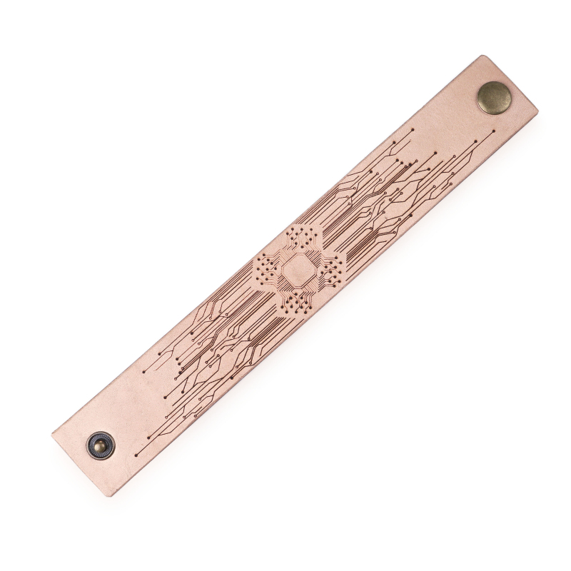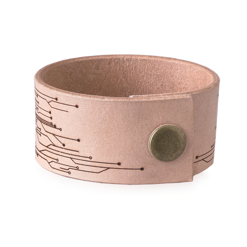 Na ulicích se sice zatím nepotulují roboti a kvalitní cyberware se nejspíše vyvíjí jenom někde v tajné laboratoři, ale apokalypsa už je určitě za rohem. Až přijde, budete díky nám alespoň vypadat stylově. Díky elegantnímu náramku z naší dílny uděláte perfektní dojem v té nejhorší nálevně i na schůzce vaší oblíbené megakorporace. Je vyrobený z lakované 2-3 mm hrubé hovězí kůže, která je příjemná na nošení a nedráždí pokožku. Když se o něj budete dobře starat, bude vaším společníkem na hodně dlouhou dobu. Náramek se zapíná na cvoček a můžete si vybrat z variant ve dvou různých délkách – 21 cm (obvod zápěstí 19 cm) a 24 cm (obvod zápěstí 22 cm). Šířka je 3 cm a náramek zdobí ornamenty inspirované elektronikou a tištěnými spoji. Pořiďte si cyberpunkový náramek už dnes, zítra může být pozdě.