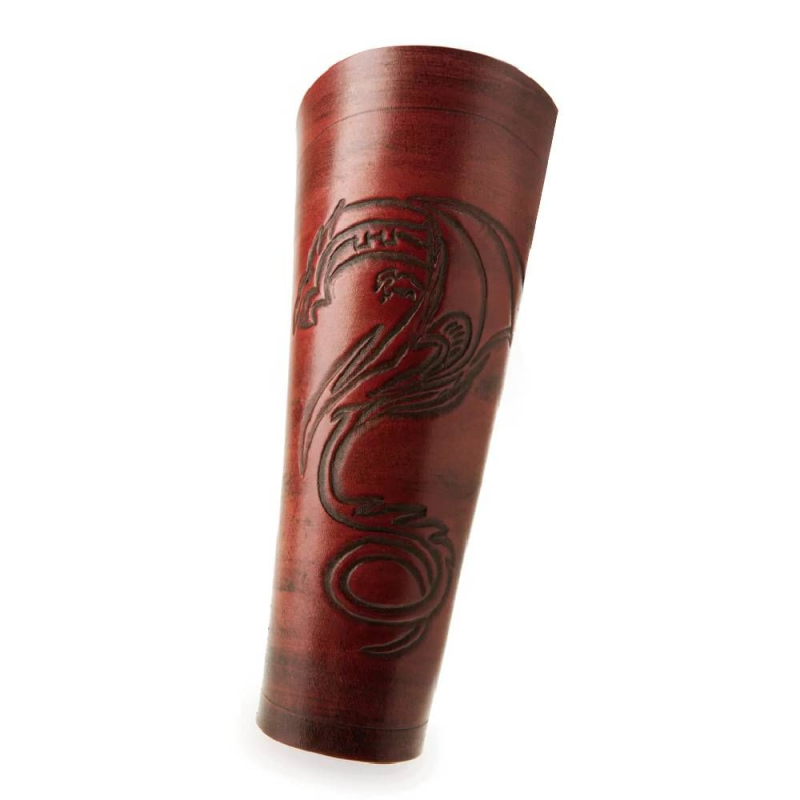 Pořádný nátepník je základní výbavou každého správného dračího bojovníka! Nátepník Dragon vyrábíme z té nejhrubší hovězí kůže, kterou máme v nabídce - hrubá je cca 4 mm. Šněrování je na koženou tkanici, která je součástí nátepníku. Cena je za jeden nátepník. Nátepník je z přírodní kůže barvené gelovými barvami: bordó, hnědá a oranžová. Motiv draka je vytvořen ruční ražbou - každý kus je unikát. Podobný nátepník vám jsme schopni udělat podle vašich představ - opatřit ručně rytým motivem dle vašeho návrhu. Stačí si zvolit jakýkoli nátepník z naší nabídky v přírodní variantě a spolu s ním objednat zdobení na přání v požadované barvě.