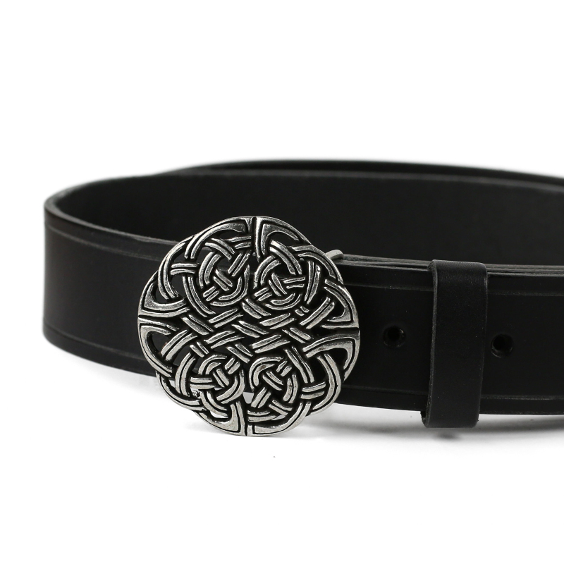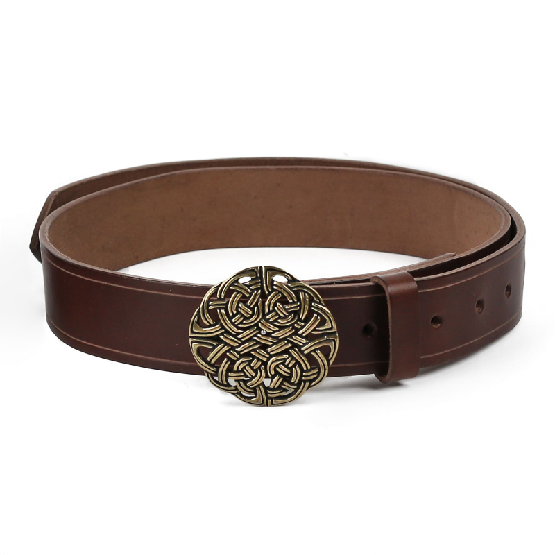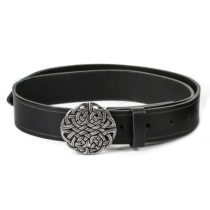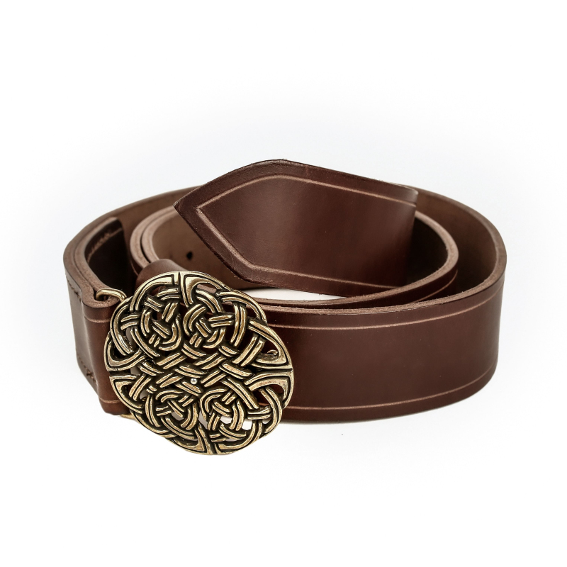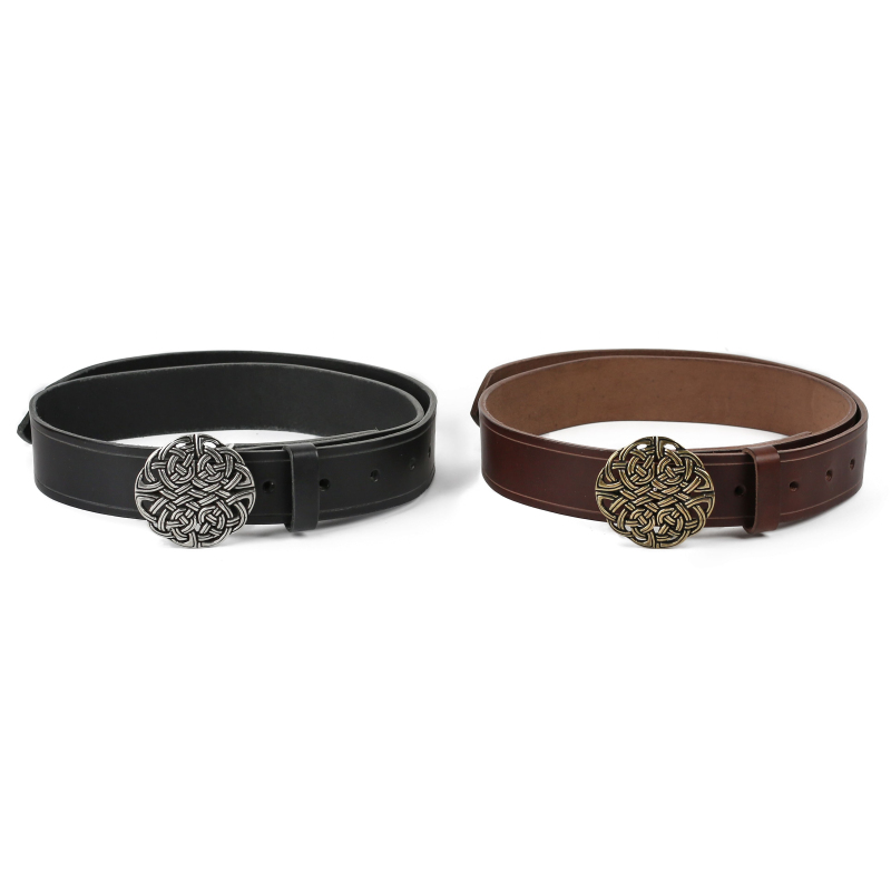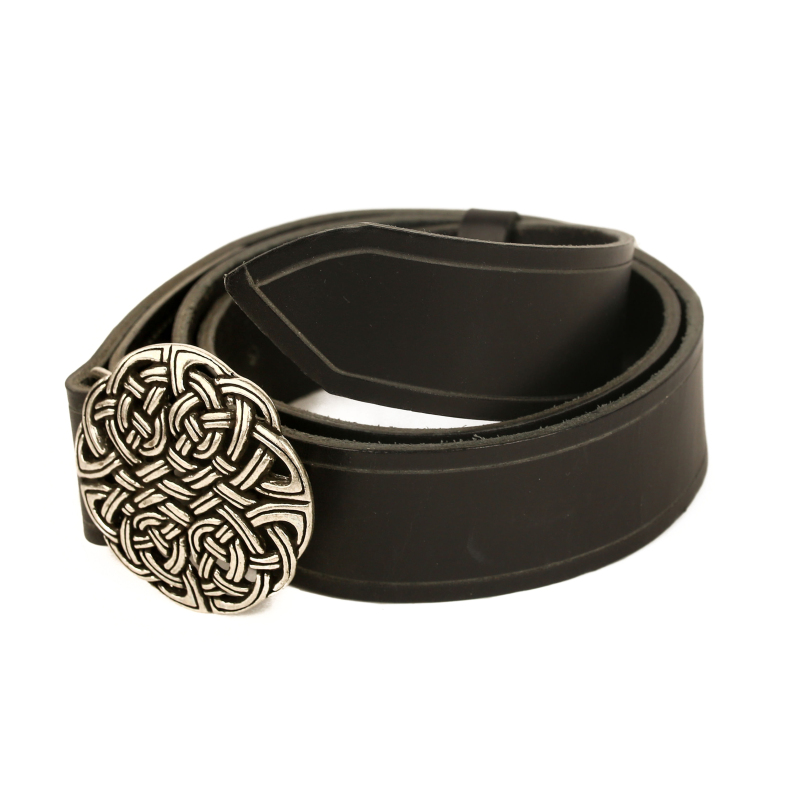 Kvalitní kožený opasek zdobí kovová spona s tradičním keltským uzlem, který nositele ochrání před zlými silami a démony, jichž na Larpech a keltských slavnostech není málo. Opasek je opatřen masivní kovovou sponou (průměr 6 cm) s trnovým zapínáním a má dírky v rozmezí obvodu pasu cca 69 - 93 cm. K mání ve dvou variantách: z hnědé kůže se sponou v barvě bronzu a z černé kůže se stříbrně zbarvenou sponou. Bude ideálním koženým doplňkem k dobovému keltskému kostýmu, ale slušet mu to bude i u jiných pánských fantasy kostýmů. Na přání můžeme vyrobit opasek dle požadovaných parametrů, například delší než 110 cm, jiná barva a pod. V případě zájmu nás neváhejte kontaktovat, nebo napište požadavek do poznámky k objednávce.