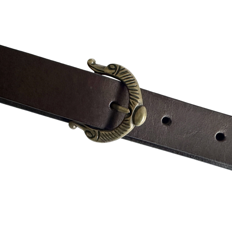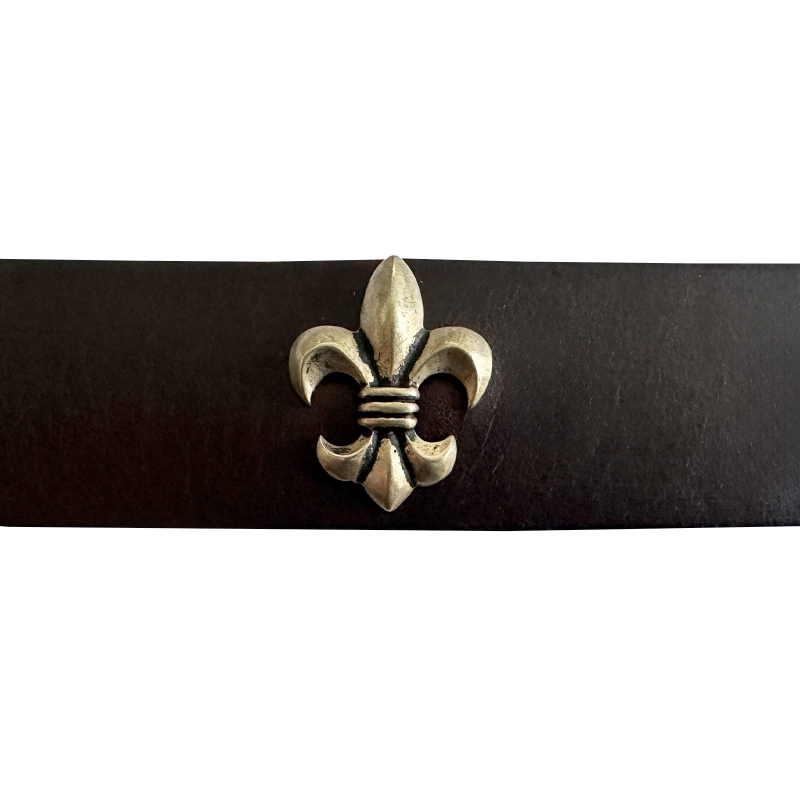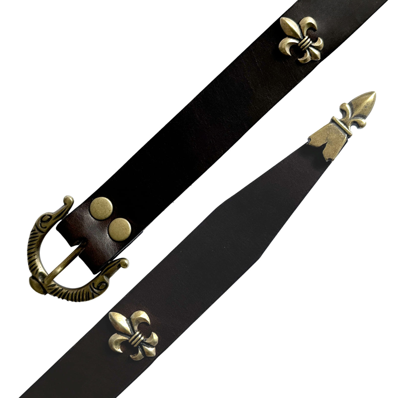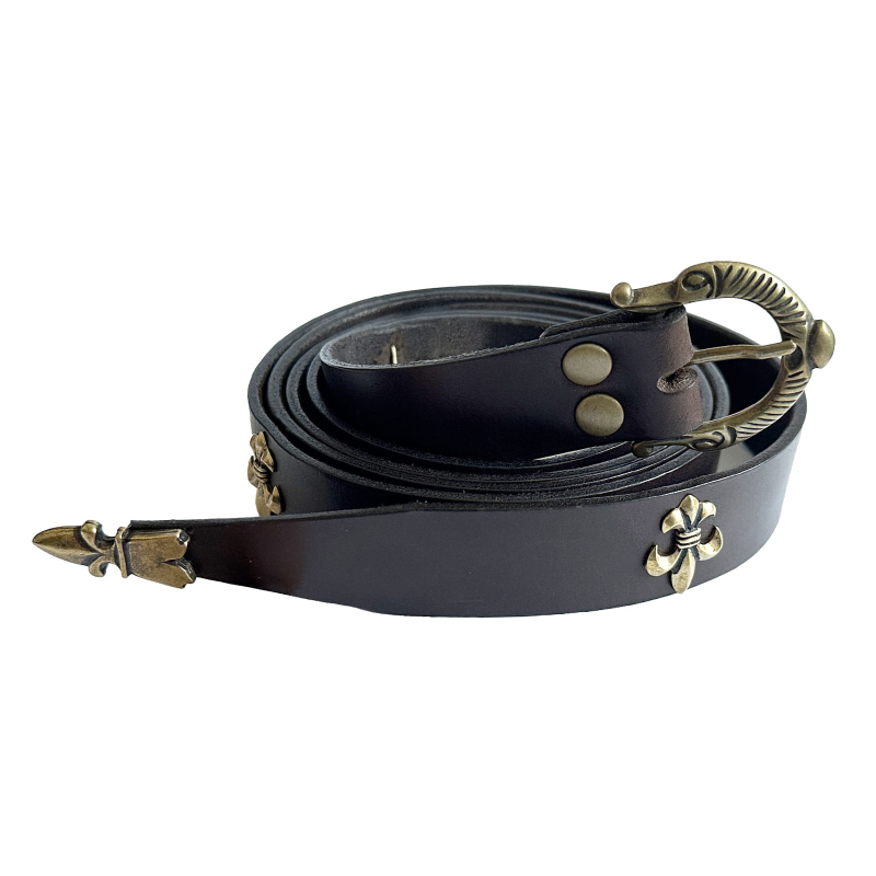 Vylepši svůj středověký kostým tímto zdobeným koženým hnědým opaskem a přidej mu autentický historický šmrnc! Celý opasek je ozdoben jemnou kovovou dekorací ve tvaru stylizované lilie (Fleur de Lys), typickou pro 15. století. V středověku byla lilie symbolem čistoty a nevinnosti a spojována s Pannou Marií. Trojitý tvar květu navíc připomíná křesťanskou Trojici – Otce, Syna a Ducha svatého, což dodává opasku historický a duchovní význam. Je zakončen kovovou koncovkou v barvě mosazi, inspirovanou obdobím 1250–1500 AD, s rozměry 3,4 x 1,4 cm, která chrání konec pásku a dodává mu autentický středověký vzhled. S tímto páskem bude tvůj středověký outfit kompletní pro středověké LARP akce a historické rekonstrukce! Rozměry: 170 x 2,5 cm.