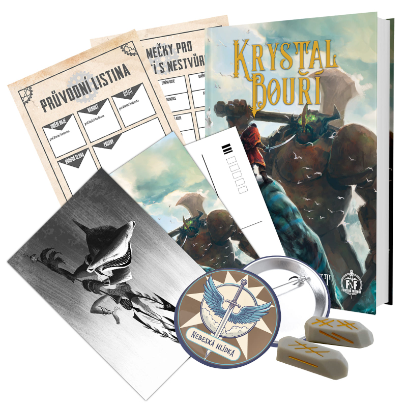 Vydej se do vznášejícího se souostroví Pangarie jako člen Nebeské hlídky a čel hrozbě, která může zničit celý svět. Když se ostrůvek Nimbus zřítí do Oceánu bouří, je na tobě prozkoumat zbylé ostrovy, bojovat s bouřemi a mořskými příšerami a pokusit se vyzdvihnout Nimbus z hlubin. Tento gamebook z legendární série Fighting Fantasy, poprvé v češtině, pochází z pera Rhianny Pratchett, dcery slavného spisovatele Terryho Pratchetta. Připrav se na napínavé dobrodružství, kde každé tvé rozhodnutí ovlivní osud Pangarie. Sběratelský komplet obsahuje kromě knihy Krystal bouří také unikátní kostky ve tvaru krystalu, záložku, dvě pohlednice s motivy z knihy a odznak Nebeské hlídky. Obsah kompletu: Krystal bouří Unikátní kostky ve tvaru krystalu (2xk6) Průvodní listina ve formě záložky Dvě jedinečné pohlednice s motivy z knihy Placka odznak Nebeské hlídky