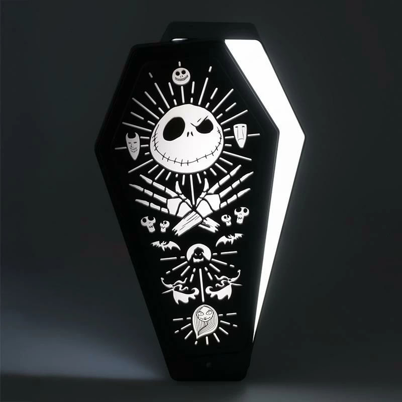 Tahle rakev rozhodně nepatří pod zem – ale do pokoje každého milovníka Jacka Skellingtona! Lampa ve tvaru rakve je inspirovaná kultovním filmem Ukradené Vánoce od Tima Burtona a přináší do tvého interiéru pořádnou dávku halloweenské atmosféry, klidně po celý rok. Je vysoká 28,5 cm, takže se neztratí ani jako samostatná dekorace. A co je nejlepší? Uvnitř víka se ukrývá malé kouzlo! Nakloň ji doleva a rozsvítí se tajuplné fialové světlo, nakloň ji doprava a začne zářit bíle. Nabízí 4 úrovně jasu a má i noční senzor, takže se přizpůsobí každé náladě. Ať už chceš jen slabé světlo před spaním nebo temnou kulisu na filmový večer. Napájet ji můžeš přes USB kabel nebo pomocí 3 AAA baterií (nejsou součástí balení), takže ji snadno umístíš kamkoli – na poličku, noční stolek nebo vedle své sbírky burtonovských pokladů!