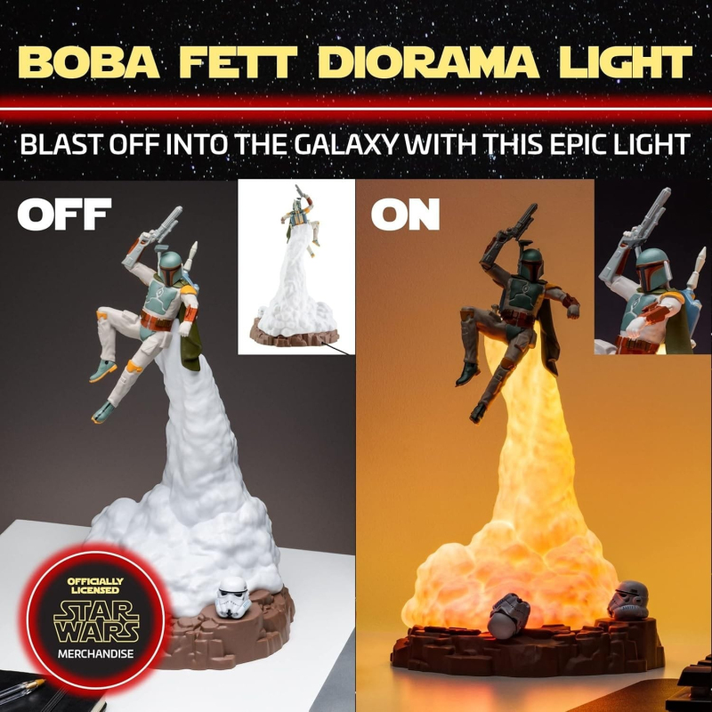 Ať už se právě nacházíš v kterékoli části vesmíru, lampička v podobě figurky nájemného lovce Boba Fetta ze Star Wars ti posvítí i v těch nejtemnějších koutech galaxie! Slavný lovec odměn ve svém jetpacku je součástí jedinečného dioramatu s interaktivní helmou Stormtroopera - jejím otočením si můžeš zvolit jeden ze 3 světelných módů. Napájení: pomocí kabelu USB (součástí balení) nebo 3x batrie AAA (nejsou součástí balení).