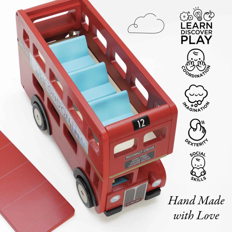 Poškozený obal. Nové zboží bez závad. Prozkoumejte velké město s klasickým červeným londýnským autobusem, jehož součástí je řidič Boris. Je vybaven autentickými detaily a gumovými koly. Autobus má prostor pro dalších 11 cestujících (nejsou součástí, je možno zakoupit samostatně), odnímatelnou střechu a horní patro pro pohodlné usazení všech pasažérů a skutečné gumové pneumatiky pro příjemnou jízdu. Britská značka Le Toy Van výrábí tradiční, vysoce kvalitní, prémiové dřevěné hračky v moderním designu. Kvalitu hraček zajišťuje pečlivý výběr přírodních materiálů a vyjímečné detailní zpracování. Le Toy Van hračky jsou ručně malované. Inspirována dětskou představivostí je společnost Le Toy Van hrdá na to, že navrhuje inovativní hračky, které podporují plnohodnotný rozvoj dětí. Společnost Le Toy Van byla založena v roce 1995 v anglickém Surrey, jako rodinná firma. Zakladaleli byli Georges Le Van a jeho syn Steven Le Van, kteři jsou pokračovateli rodinné společnosti s více než 150 letou historií a zkušenostmi v ruční výrobě dřevěných hraček. Během posledních 25 let se společnost Le Toy Van stala důvěryhodným výrobcem dřevěných hraček. Oceněné hračky se nyní prodávají ve více než 50 zemích světa. Všechny hračky splňují nejpřísnější bezpečnostní normy ICTI, ISO 9001, EN-71 a ASTM.