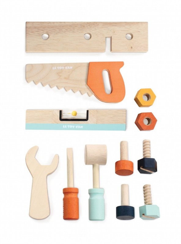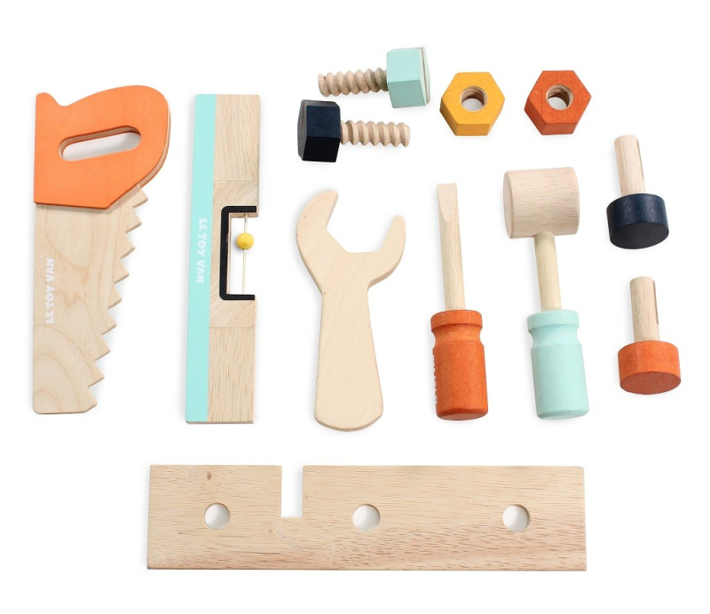 V balení najdete 12 zavalitých dřevěných doplňků, které mají velikost tak akorát pro dětské ruce. Je to pilka, kladivo, šroubovák, klíč, vodováha, 2 šrouby, 2 vruty, 2 hřebíky a dřevěná destička.