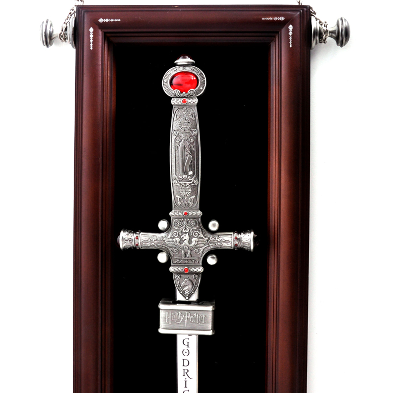 Autentická replika meče Godrika Nebelvíra z filmového zpracování Harryho Pottera. Meč je dlouhý cca 86cm, rukojeť má vykládanou skleněnými kameny. Součástí je překrásná dřevěná plaketa. Podle návrhu Godrika Nebelvíra byl meč před mnoha lety vyroben Ragnukem prvním, nejlepším skřetím stříbrotepcem. Je z ryzího stříbra a ozdoben rubíny. Jméno Godrika Nebelvíra je vytepáno pod rukojetí meče. V knihách o Harrym Potterovi jsou skřeti přesvědčeni, že všechny předměty, vyrobené jejich rukou, jim po právu náležejí, i když mohou být za úplatu pronajmuty kouzelníkovi na dobu jeho života. Kouzelníci jsou ale přesvědčeni, že když jednou za něco zaplatí, patří jim ta věc navěky, což je střetem velkého moralního dilematu Harryho Pottera v Relikviích smrti.