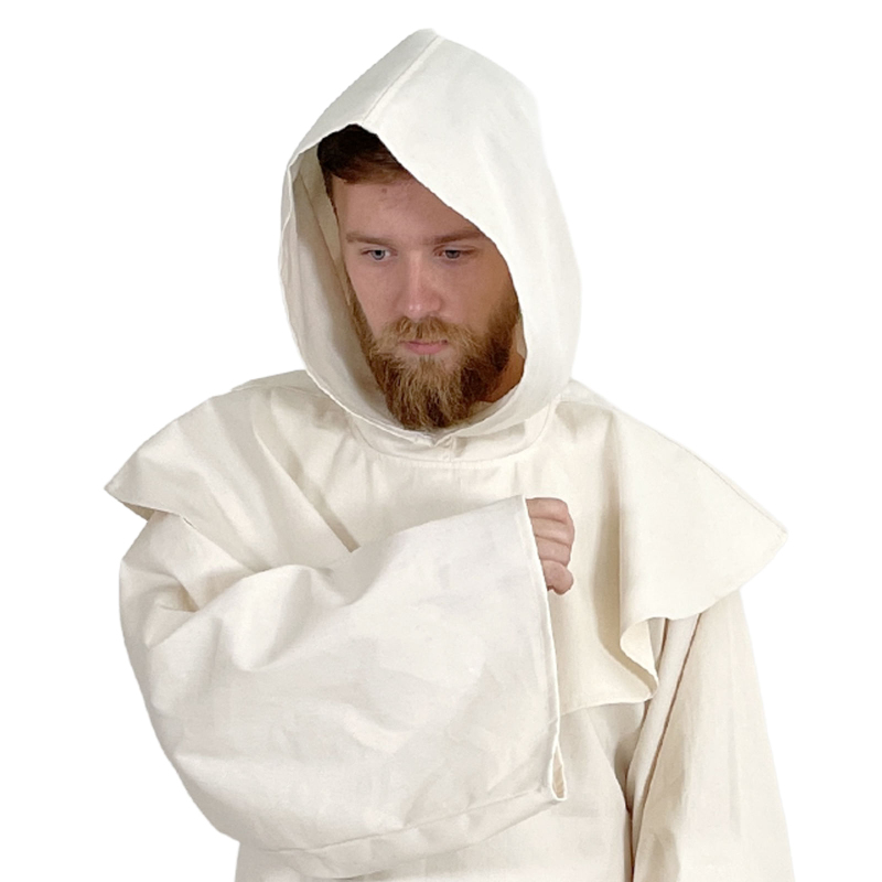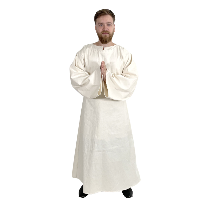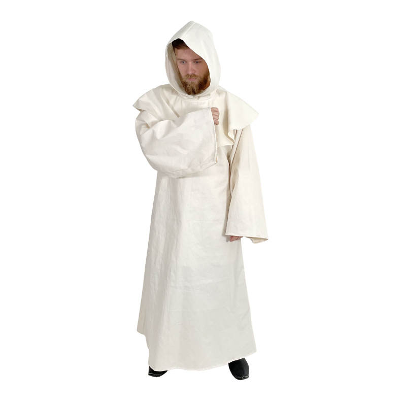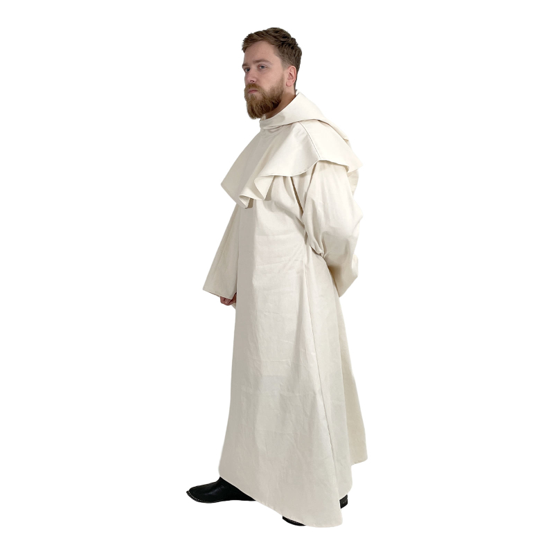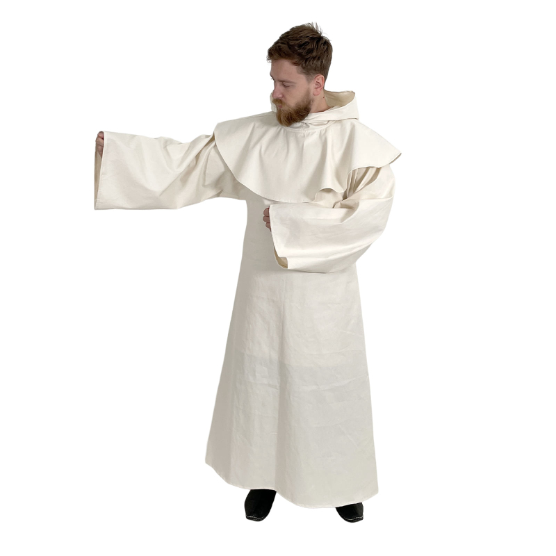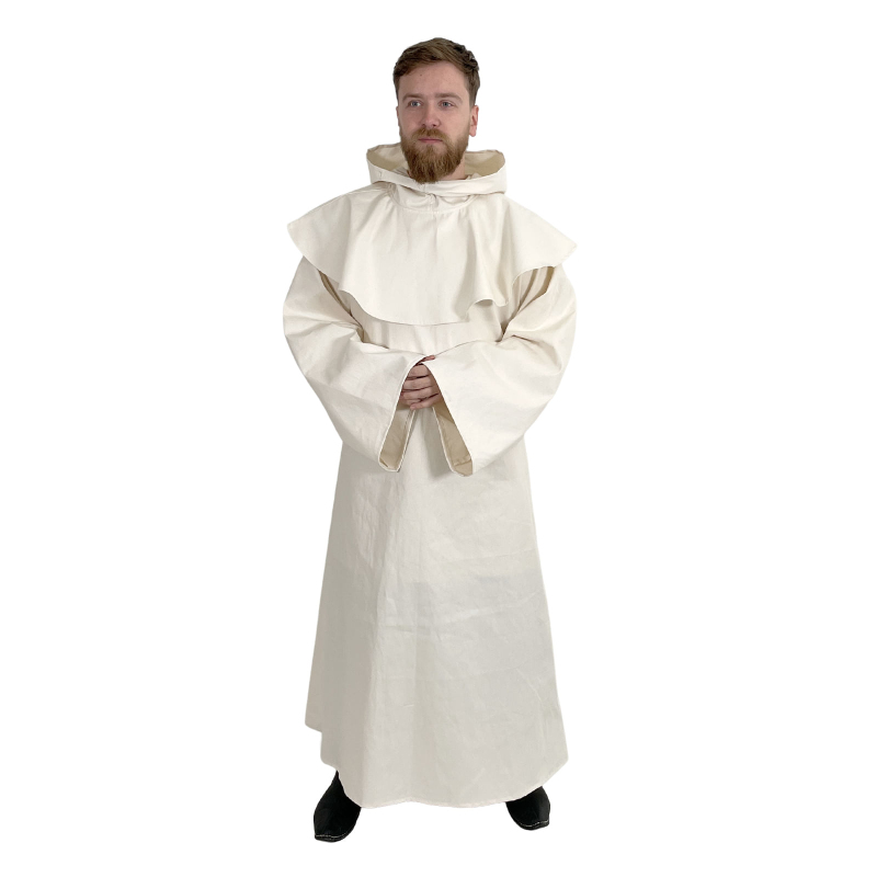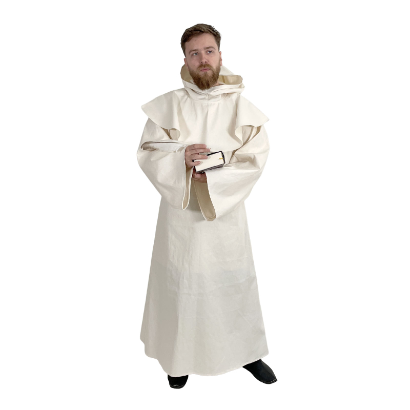 Tahle přírodní mnišská kutna je ideální volbou pro širokou škálu postav, které můžeš vzít na LARP, fantasy a historické akce. Ať už jsi tichý mnich, poustevník, učenec, nebo bylinkář – tenhle oděv ti zaručí funkčnost a pohodlí! Kutna je šitá v naší dílně z bavlněného kepru, který má jemně krémovou, zemitou barvu. Díky volnému střihu a hluboké kapuci se snadno nosí a přizpůsobí různým postavám i vrstvám kostýmu. Kutna se skládá ze dvou částí – kápě a tuniky. Kápě má univerzální velikost a rozměry mnišské kutny se určují podle velikosti tuniky.