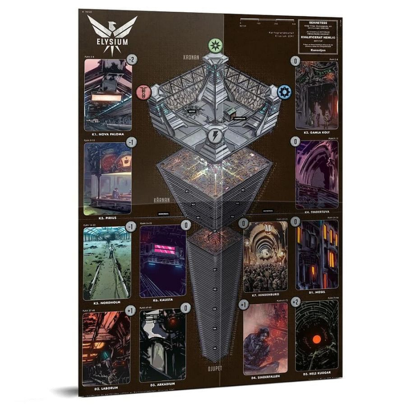 Vekoformátová barevná mapa podzemního města Elysium ze hry Mutant: Elysium RPG. Velikost mapy 39.5 cm x 55.8 cm.