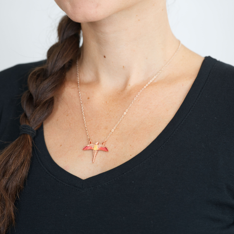 Krásný náhrdelník s přívěskem v podobě Fawkese, fénixe profesora Albuse Brumbála z Bradavic. Říká se, že Fawkesova pera byla součástí kouzelnických hůlek Harry Pottera a Voldemorta. Přívěsek je vyroben ze slitiny kovu pozlacené růžovým zlatem a očaruje každého, kdo ho spatří! Součástí balení je řetízek o délce 40 cm s možností nastavit o další 4 cm.
