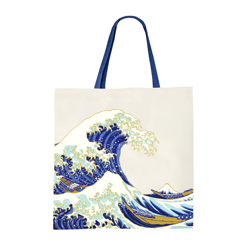 Plátěná nákupní taška s potiskem slavného díla japonského malíře Hokusaie Kacušiky - Velká vlna u pobřeží Kanagawy (神奈川沖浪裏), také známá jako Velká vlna, ti bude skvělým společníkem na nákupy, výlety nebo jen tak na každodenní nošení. Vyraž do světa a mezi tvé přátelé s krásnou taškou nebo udělej radost i jiným nadšencům japonského umění!