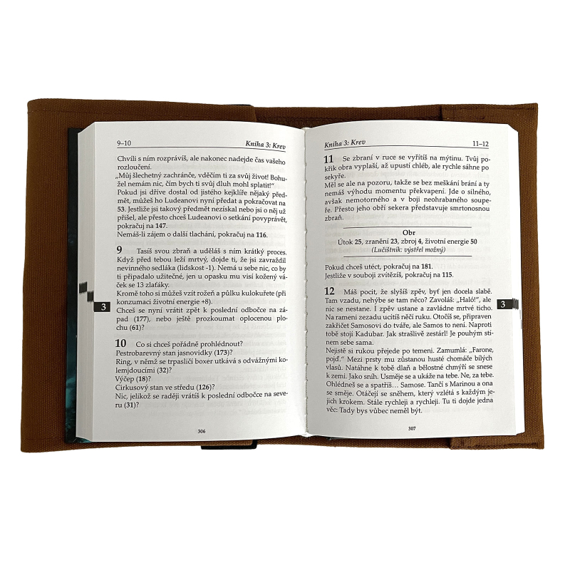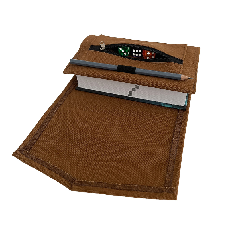 Na výdrž vašeho gamebooku, který s vámi všude cestuje, už házet kostkou nemusíte! Pro toulavé dobrodruhy, jsme ušili speciální obal na gamebook s kapsou na kostky a gumičkou na tužku. Zavinovací látkový obal je ušitý na míru gamebookům z nakladatelství Mytago (kromě Rytíře temného slunce). Výška knihy 16,5 cm, na šířku se obal přizpůsobí. Jde o poctivou ruční práci a originální výrobek z naší dílny, který jinde nenajdete. Obal byl navržen tak, aby spolehlivě chránil knihu před poškozením. Zavírá se jednoduše, přetažením textilní gumy přes zabalený gamebook.