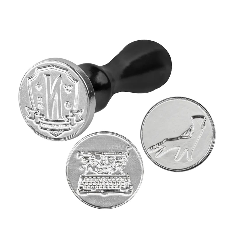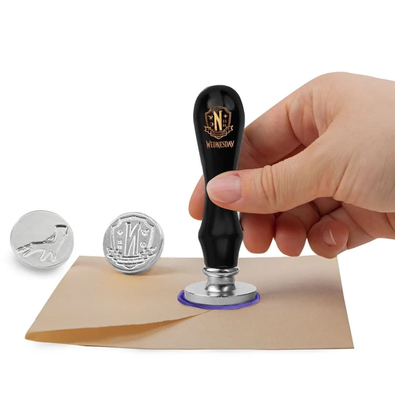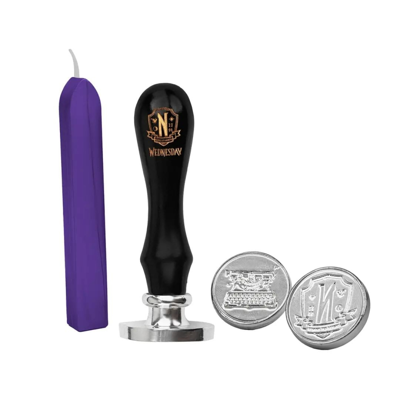 Posílejte dopisy jako slavná Wednesday. Pečetící sada pro fanoušky seriálu oblíbeného od Netflixu vám umožní vytvářet cool dopisy, přáníčka a psaní. Součástí sady jsou 1 pečetidlo, 3 razidla s různými symboly (Erb Nevermore Academy, Věc a psací stroj) a 1 ks fialového pečetícího vosku.